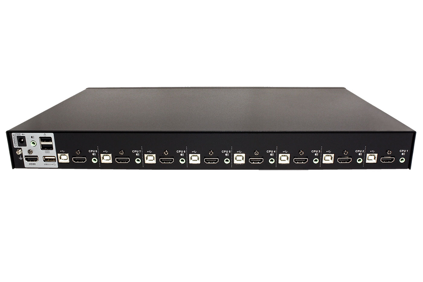 Přepínač pro ovládání 8 počítačů s HDMI porty (klávesnice, video, myš, audio) z jednoho stanoviště, s možností připojení dalších USB zařízení přes integrovaný USB hub.