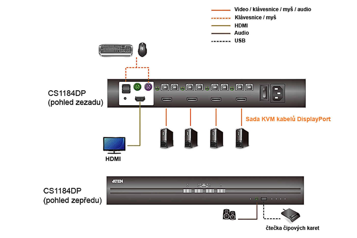 Aten KVM přepínač (USB + PS/2, HDMI, Audio) 4:1, DP, USB (CAC), zabezpečený PSS PP v3.0 (CS1184DP)