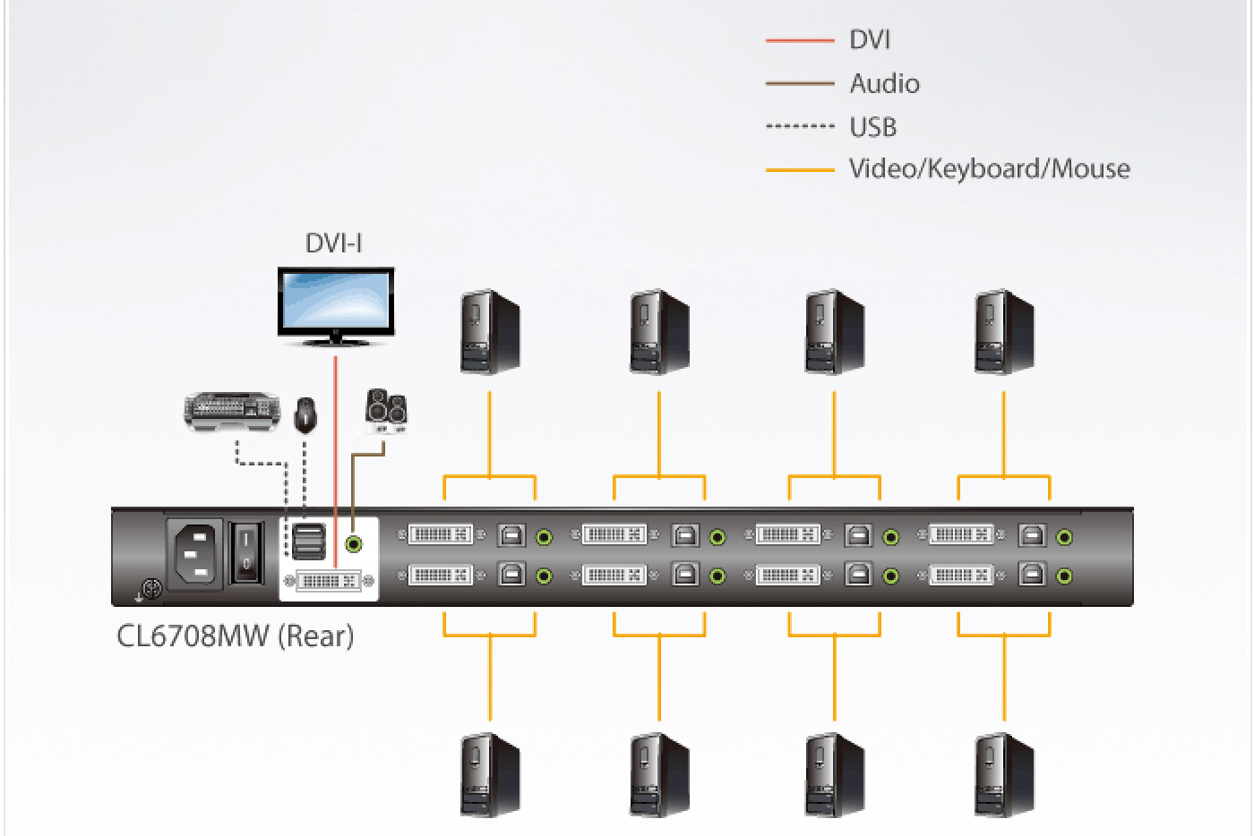 Konektory: PC: 8x DVI-I(F)dual / 8x USB B(F) / 8x stereo jack3,5F