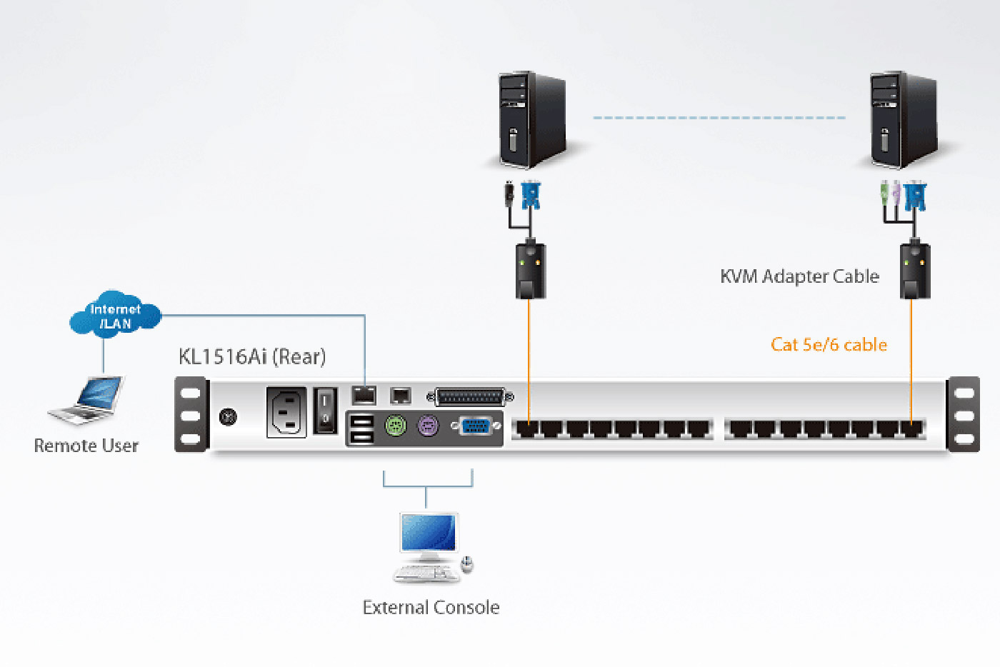 - Možnost kaskádování - celkem až 8 jednotek, lze použít přepínače KH1508A/KH1516A, ACS1208A/ACS1216A, CS1708A/CS1716A.