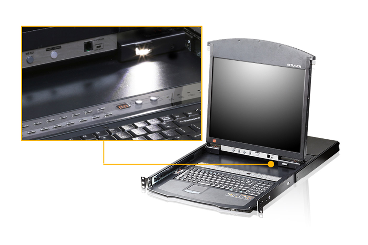 Konzole (klávesnice, touchpad a 19" LCD displej) s integrovaným přepínačem, určená pro montáž do 19" rozvaděče (výška 1U) s možností ovládání po IP. Počítače se připojují pomocí KVM modulů přes TP kat 5e. A více.