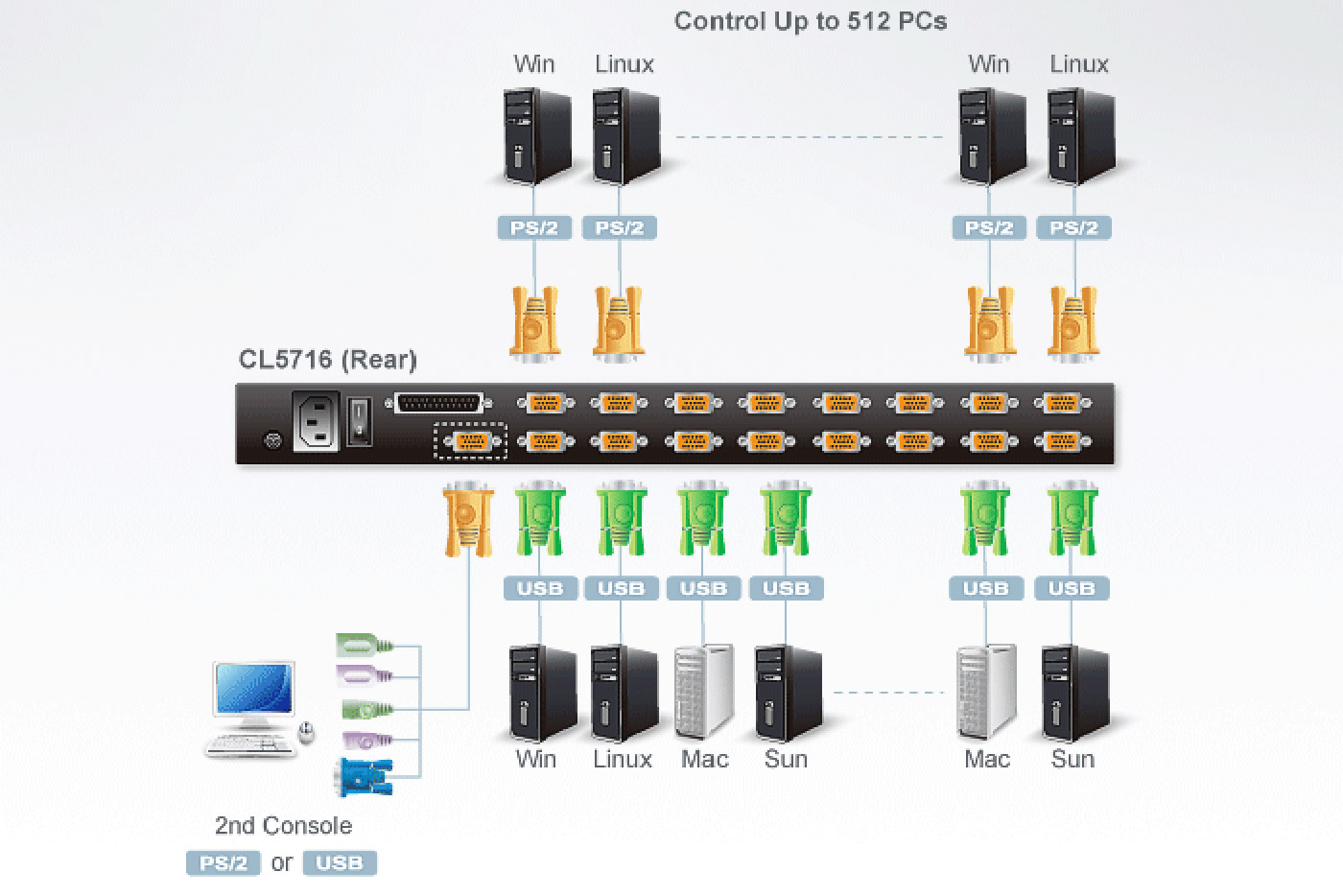 Ovládání až 16 počítačů z jednoho stanoviště s 17" displejem. V kaskádě možno připojit až 256 počítačů.