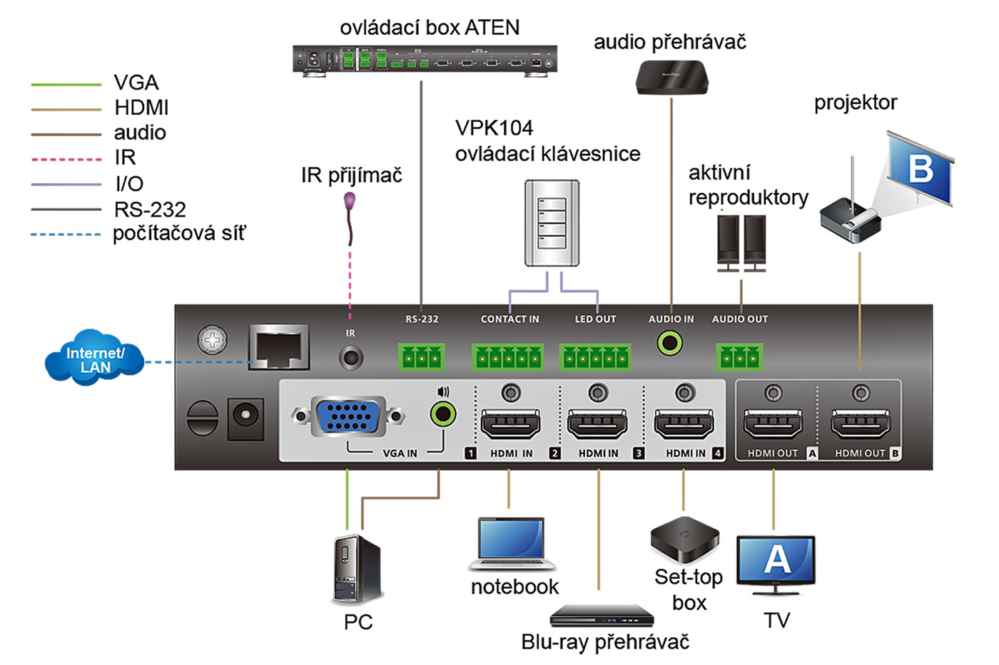 Je vhodný pro školící střediska, přednáškové sály atd. Velký výběr možností přepínání a ovládání umožňuje snadné přizpůsobení pro konkrétní aplikaci.