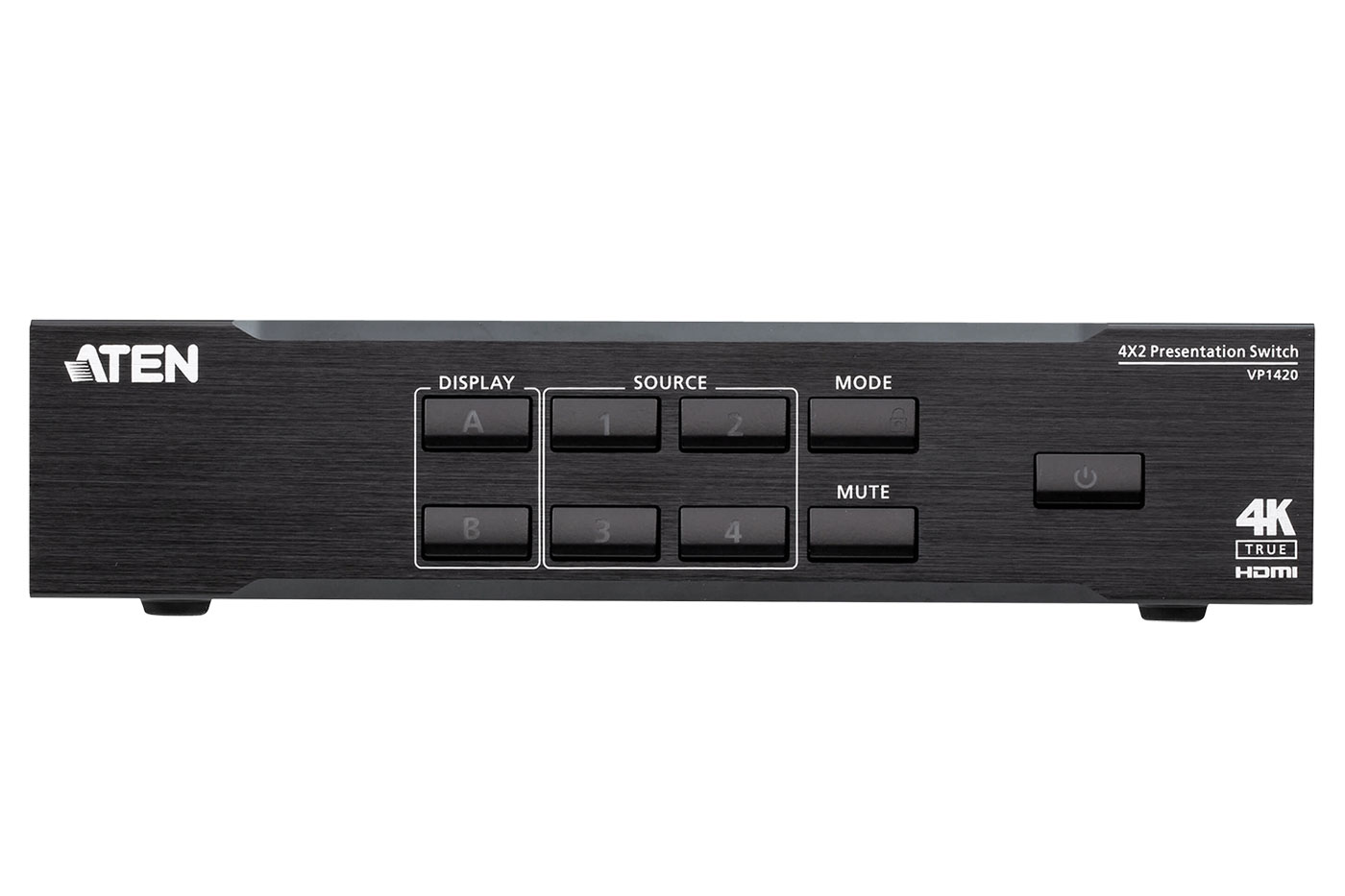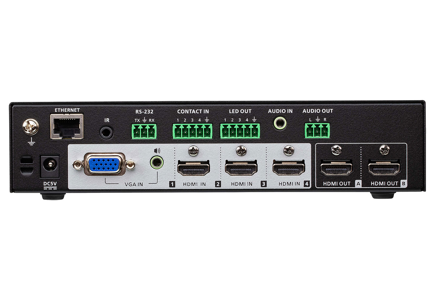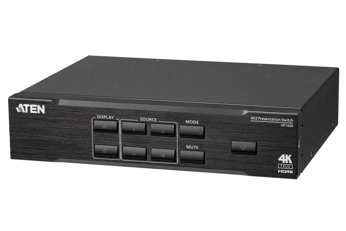 Multifunkční prezentační maticový přepínač se 4 vstupy (3x HDMI, VGA) a 2 výstupy HDMI. Disponuje audio vstupem a výstupem s možností mixování zvuku do výstupního zařízení, nebo oddělení zvuku z HDMI signálu. Přepínač podporuje rozlišení až 4K@60Hz.