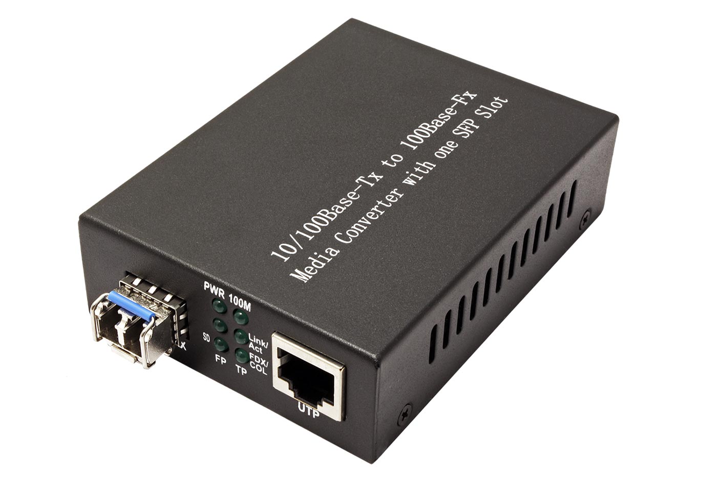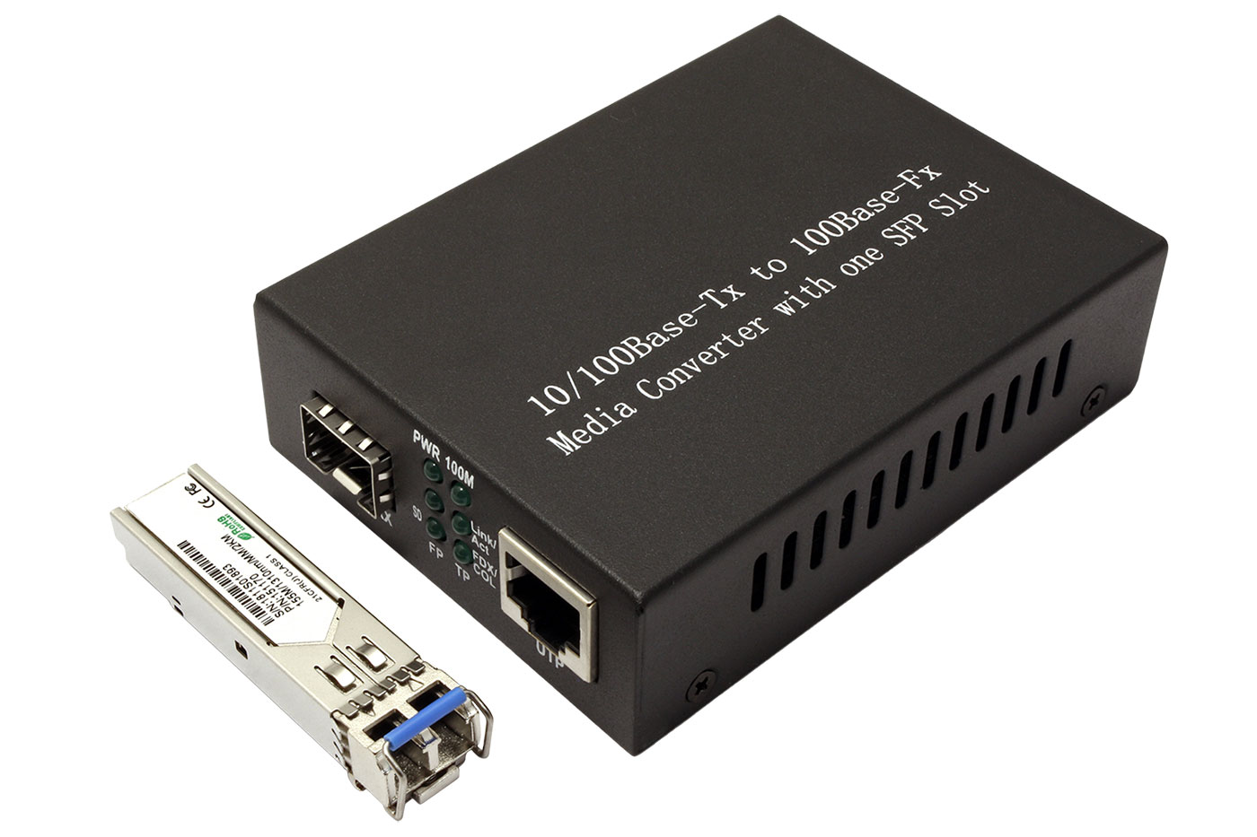 Adaptér vhodný pro prodloužení 100Mb počítačové sítě přes optickou síť. Je vybaven SFP modulem, který je možno v případě potřeby vyměnit za SFP modul s jinými parametry.