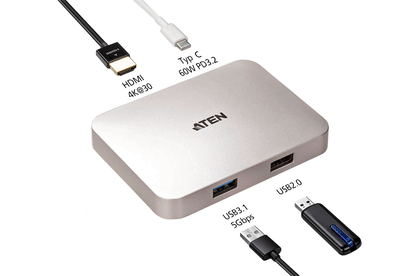 Aten Multiport adaptér USB C(M) -> HDMI A(F) (4K@30Hz), USB 3.0 A + USB 2.0 A, 2x USB C, PD (UH3235)