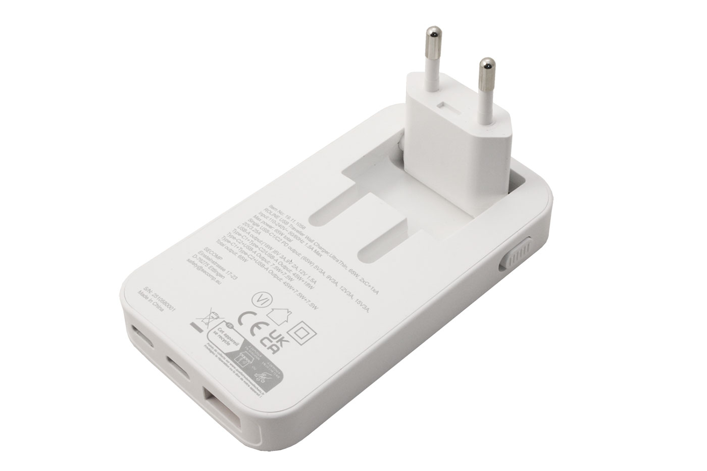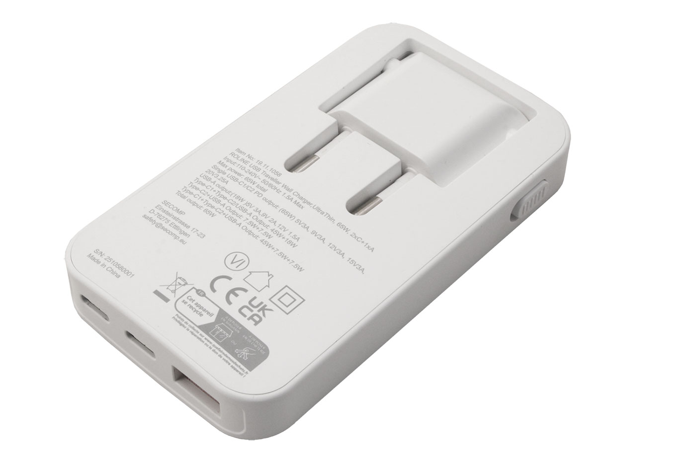 Elegantní plochý zdroj s výklopnou vidlicí pro napájení zařízení, které používají jako zdroj napájení USB port. Umožňuje rychlejší nabíjení použitím technologie Power delivery (PD) a Quick Charge(QC) s využitím různých napětí. Moderní polovodiče GaN umožňují dosáhnout vyšších výkonů i při malé velikosti zdroje.