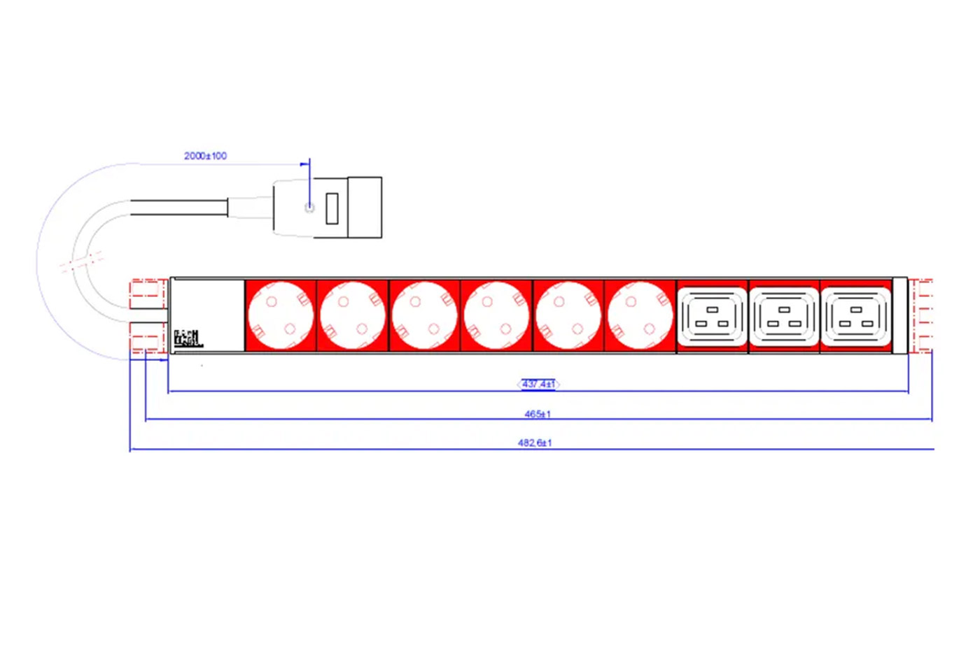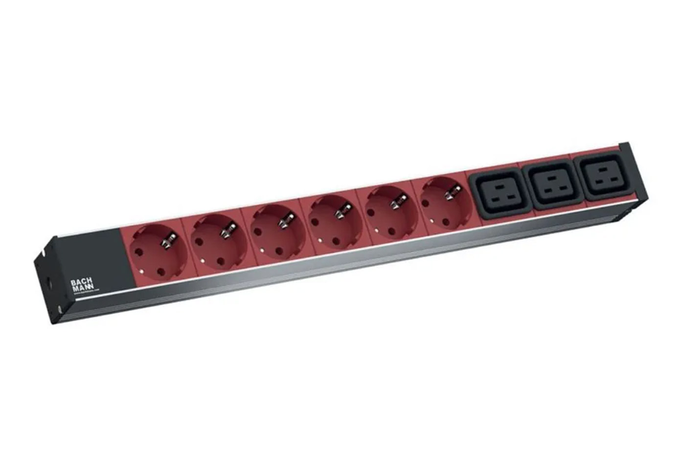 BACHMANN Napájecí panel 1U, 6x zásuvka DE + 3x C19, vidlice C20, červený, 2m (800.2333)