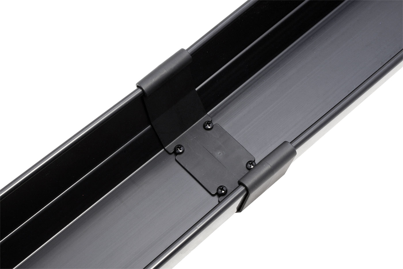Obsah balení: žlab, 2x boční držák, 4x šroub M4 x 10 + matice, 4x vrut 3,8 x 15, vrtací šablona;