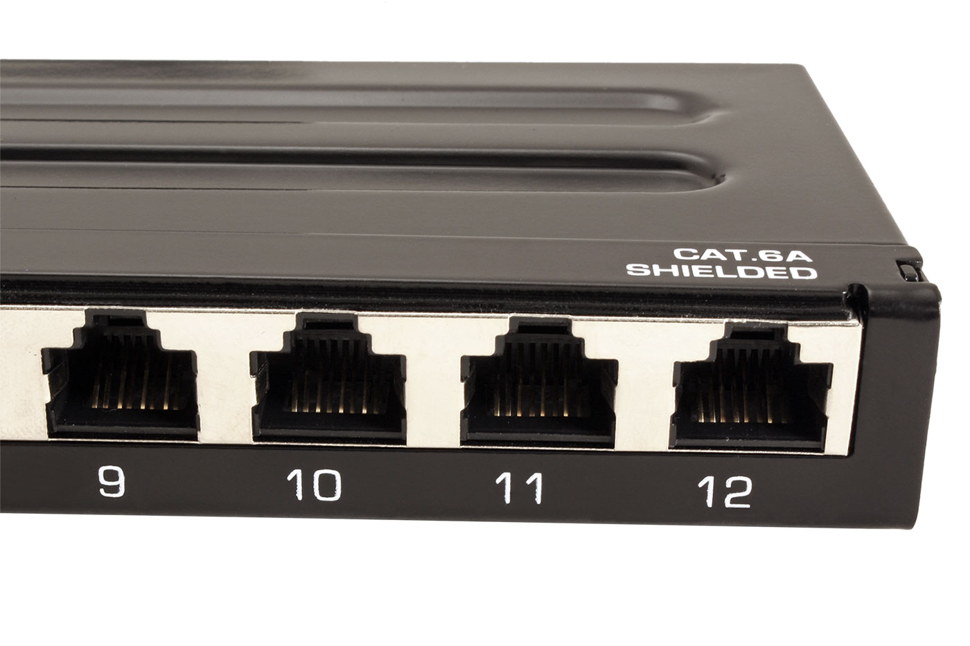 Stíněný, 12-portový patchpanel kategorie 6a pro montáž na zeď.