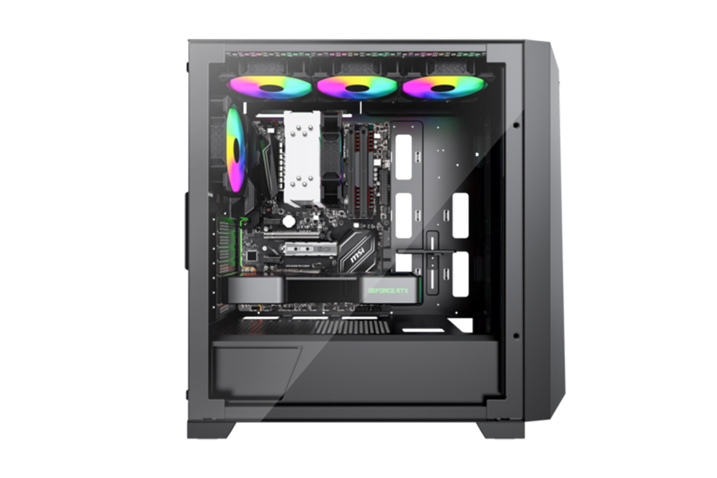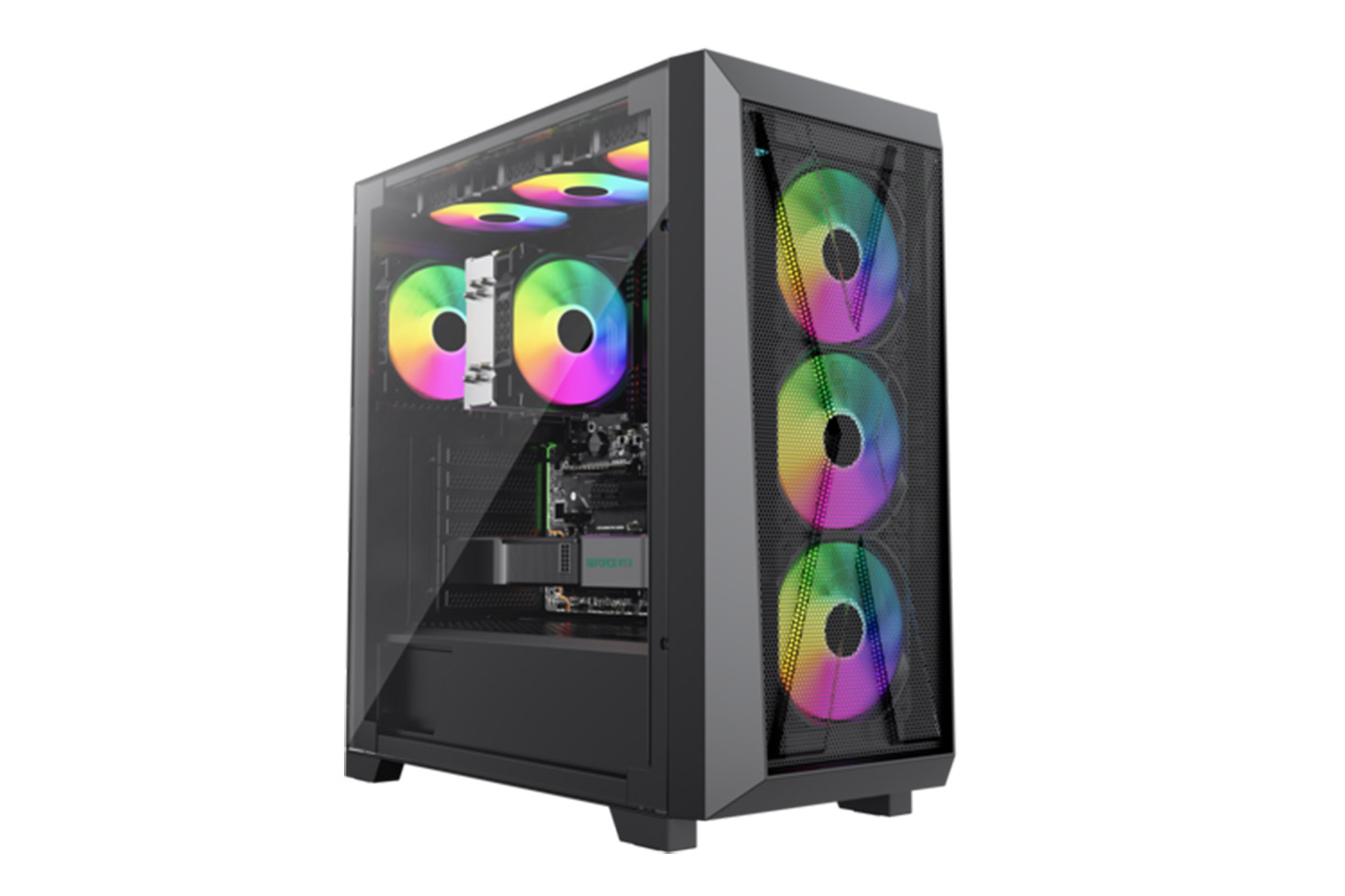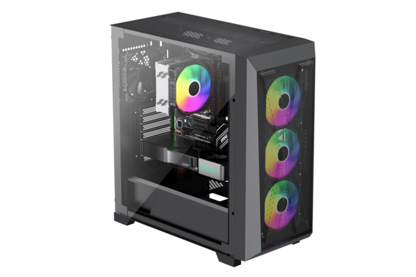 Skříň elegantnímu černému designu, ideální pro herní počítač. S podporou ARGB osvětlení na předním a bočnímu panelu z tvrzeného skla.