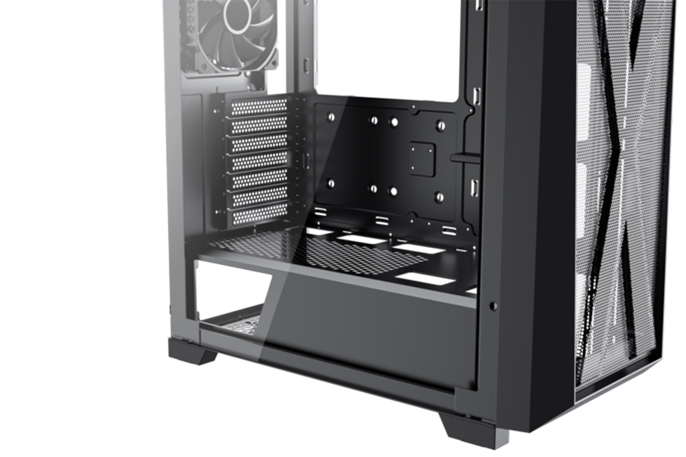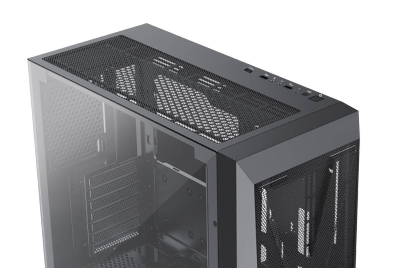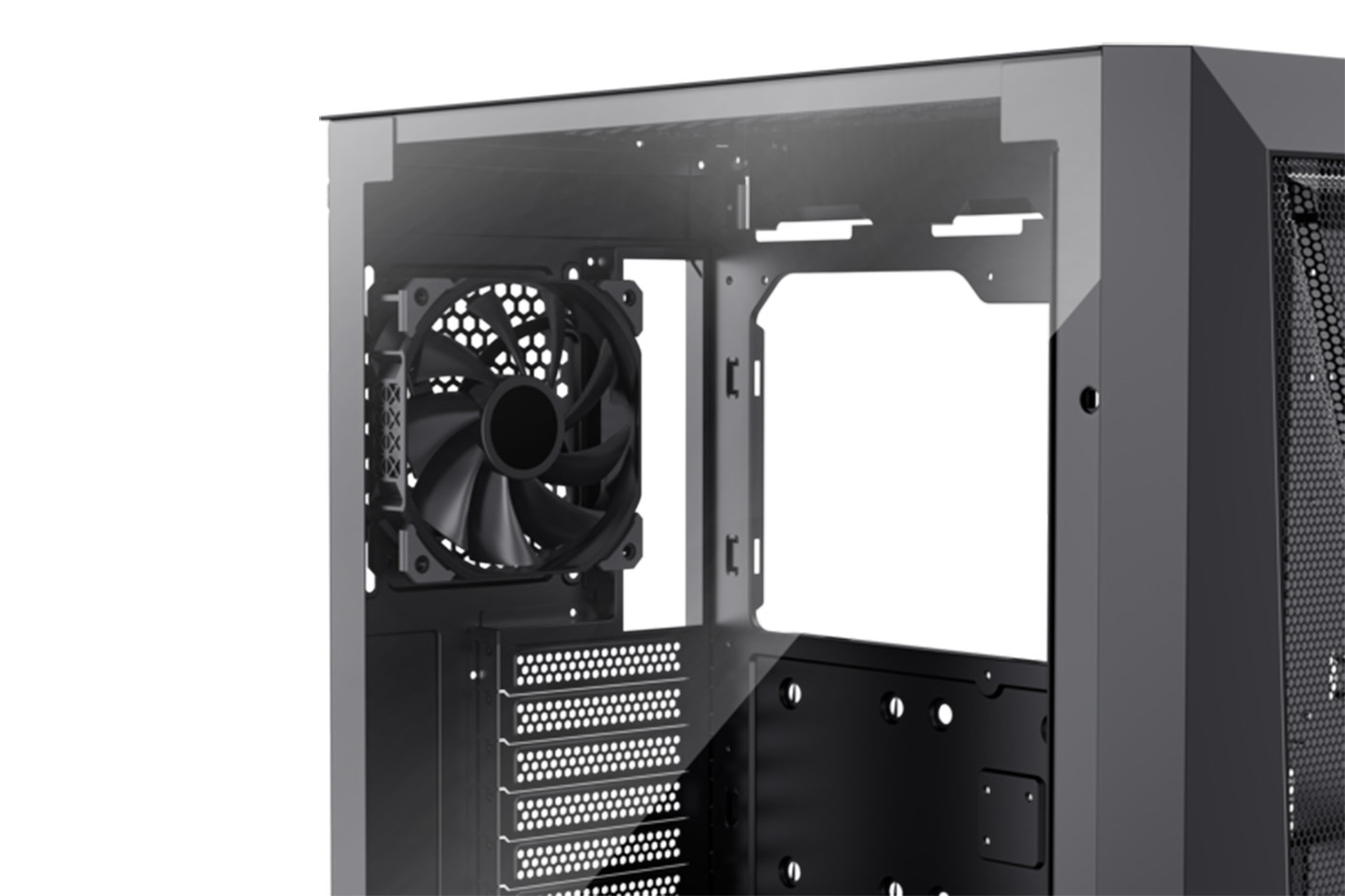 Skříň elegantnímu černému designu, ideální pro herní počítač. S podporou ARGB osvětlení na předním a bočnímu panelu z tvrzeného skla.