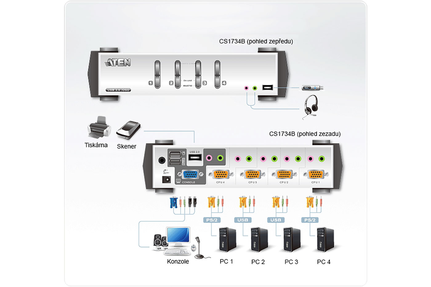 Ovládání 4 PC přes USB a VGA z jednoho stanoviště (KVM). Je možno připojit (a přepínat ) 2x USB 2.0 zařízení.
