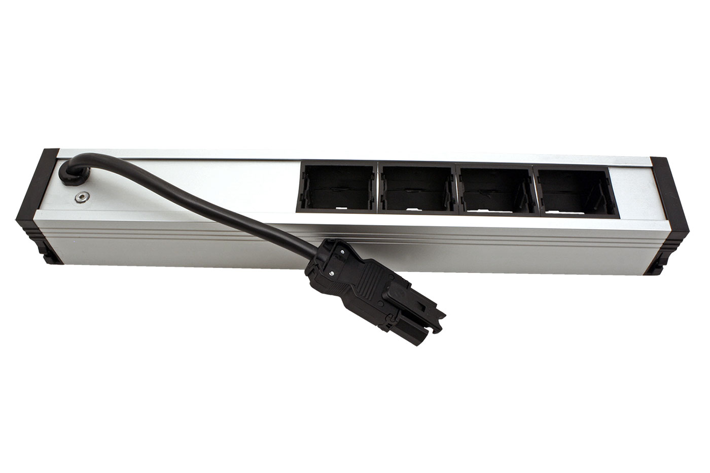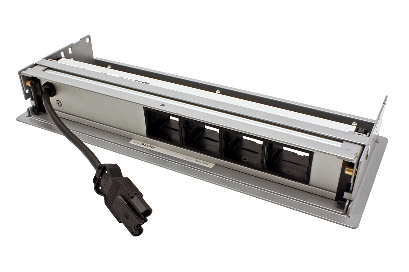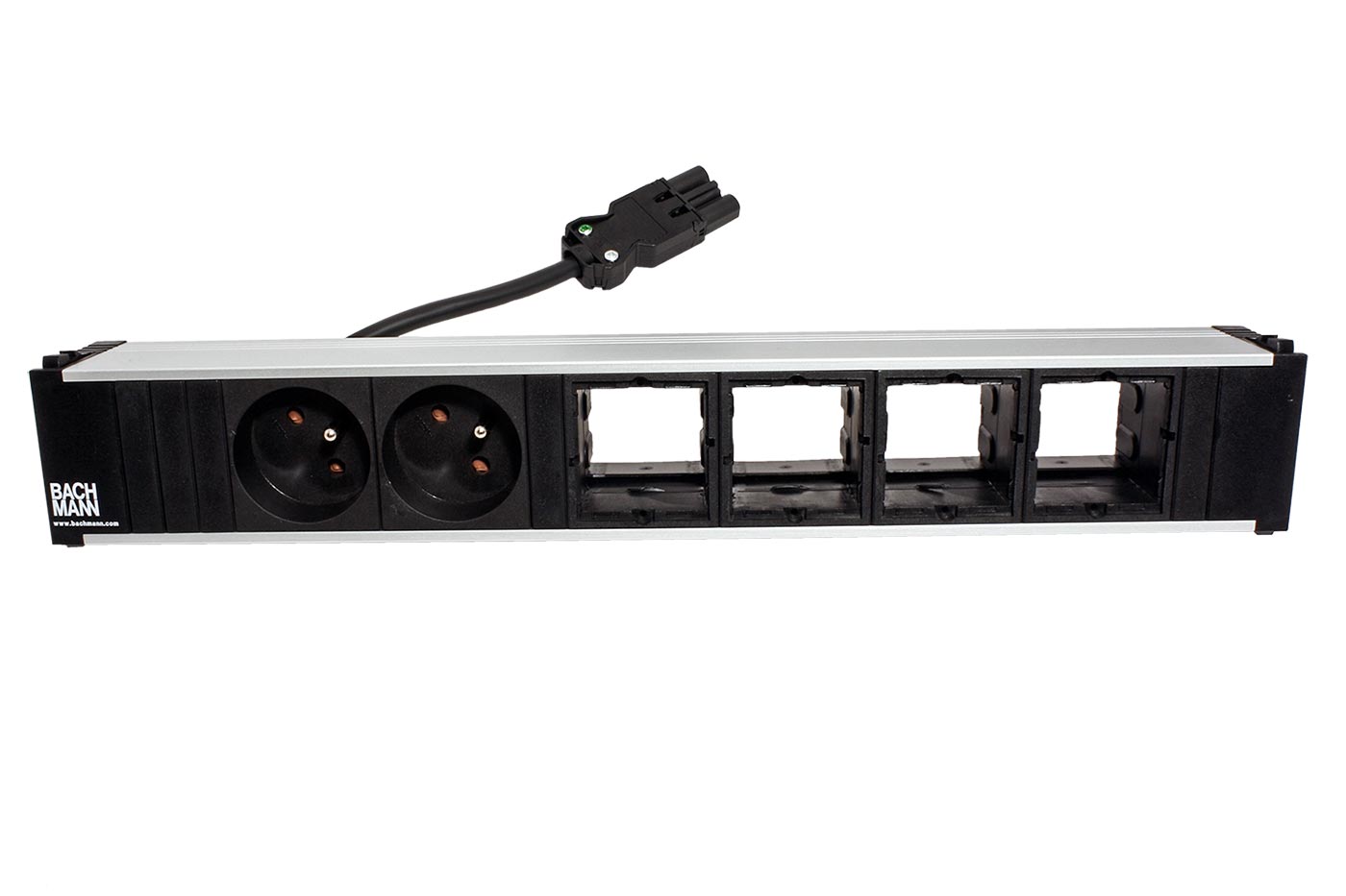 Box se 2 napájecími zásuvkami (CZ) a 4 volnými pozicemi, určený pro montáž do dlouhého rámu systému CONI.