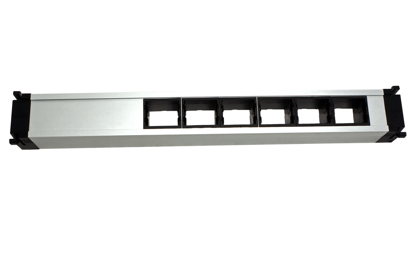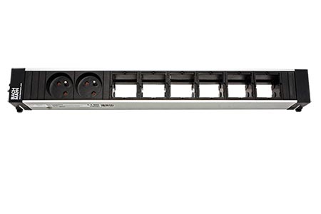 Box se 2 napájecími zásuvkami a 6 volnými pozicemi, určený pro montáž do rámu systému CONFERENCE nebo TOP FRAME.
