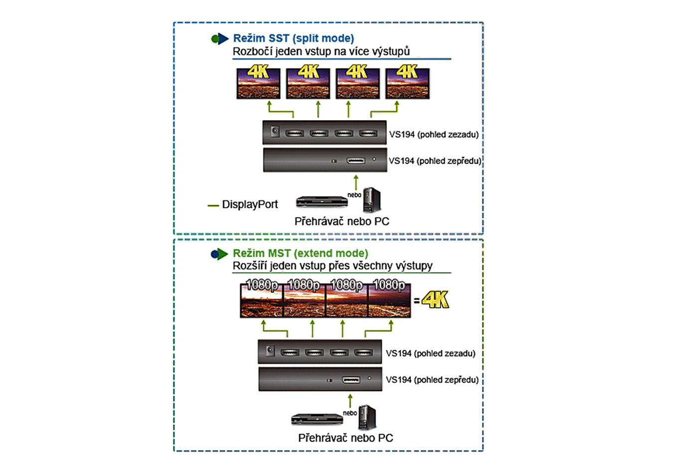 - Režim SST - vstupní signál kopíruje na každou obrazovku jednotlivě (na všech je stejný obraz) - EDID informace se kopírují z výstupu 1
