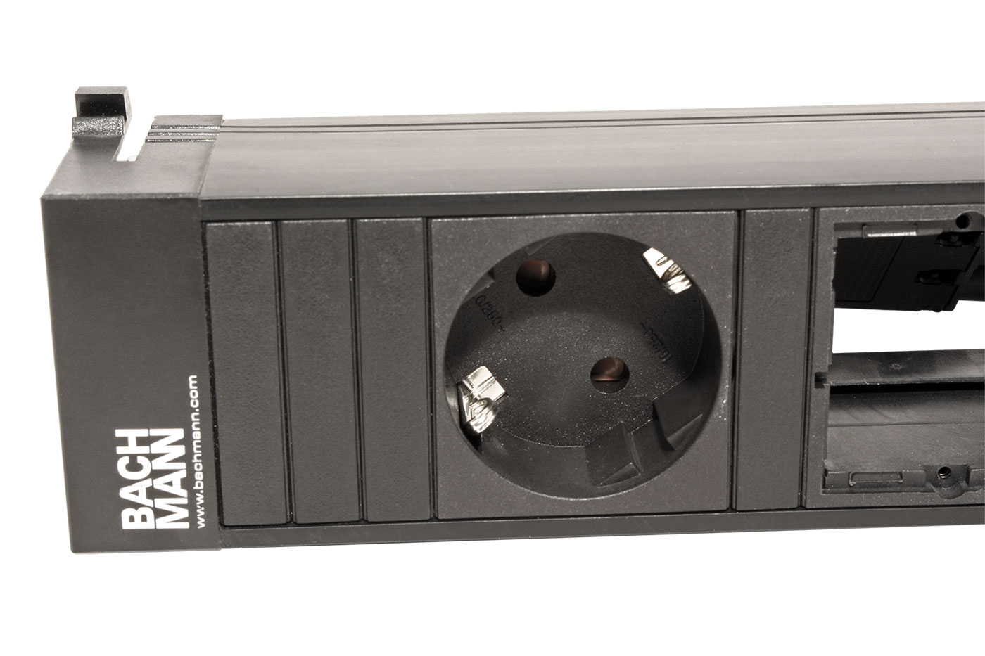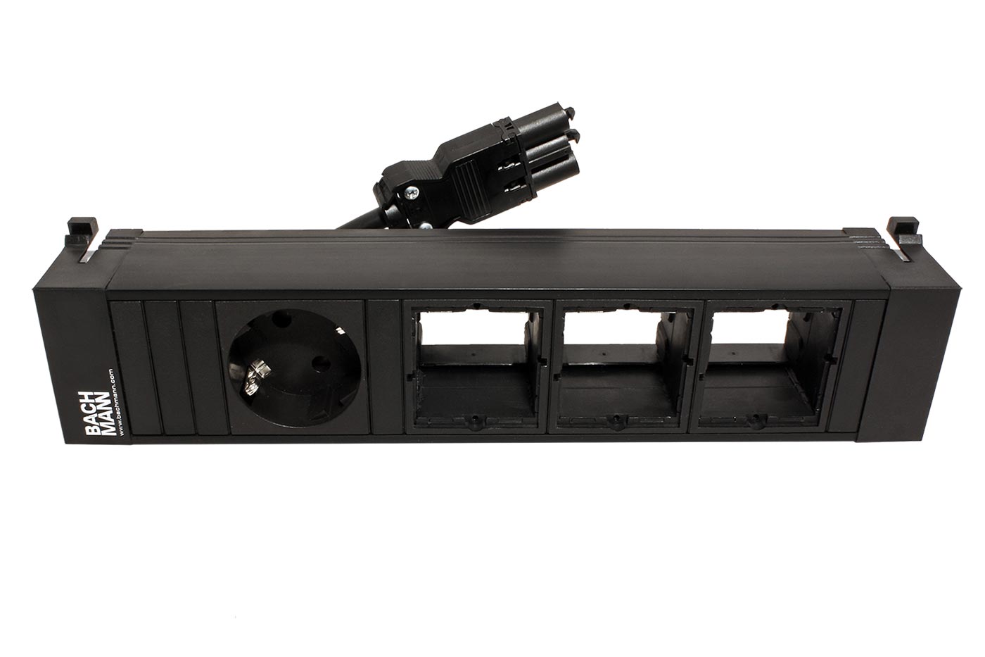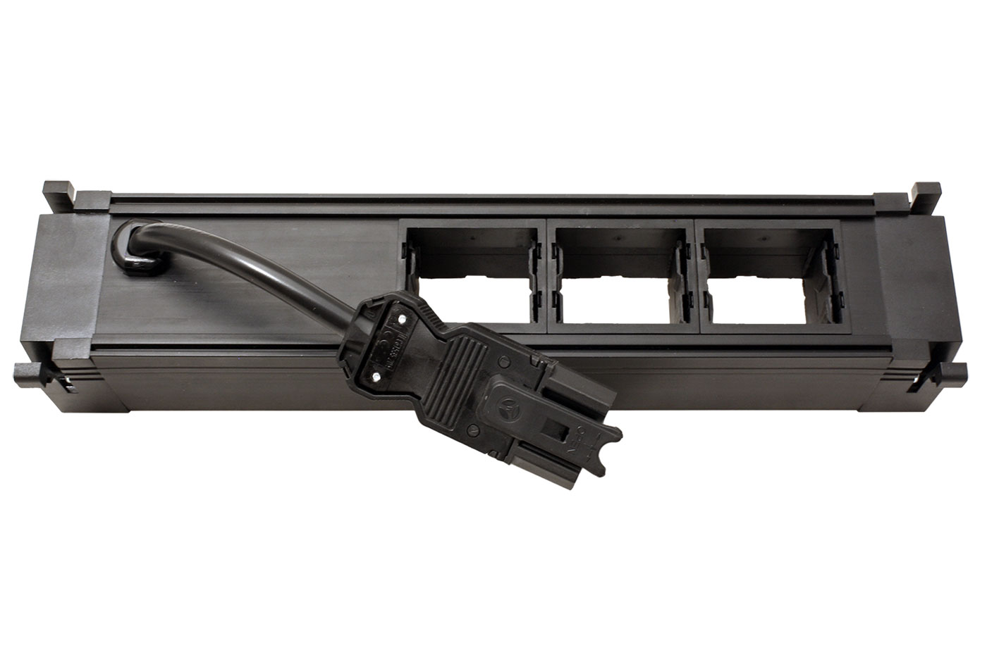 Box se 1 napájecí zásuvkou (DE) a 3 volnými pozicemi, určený pro montáž do středního rámu systému POWER FRAME.
