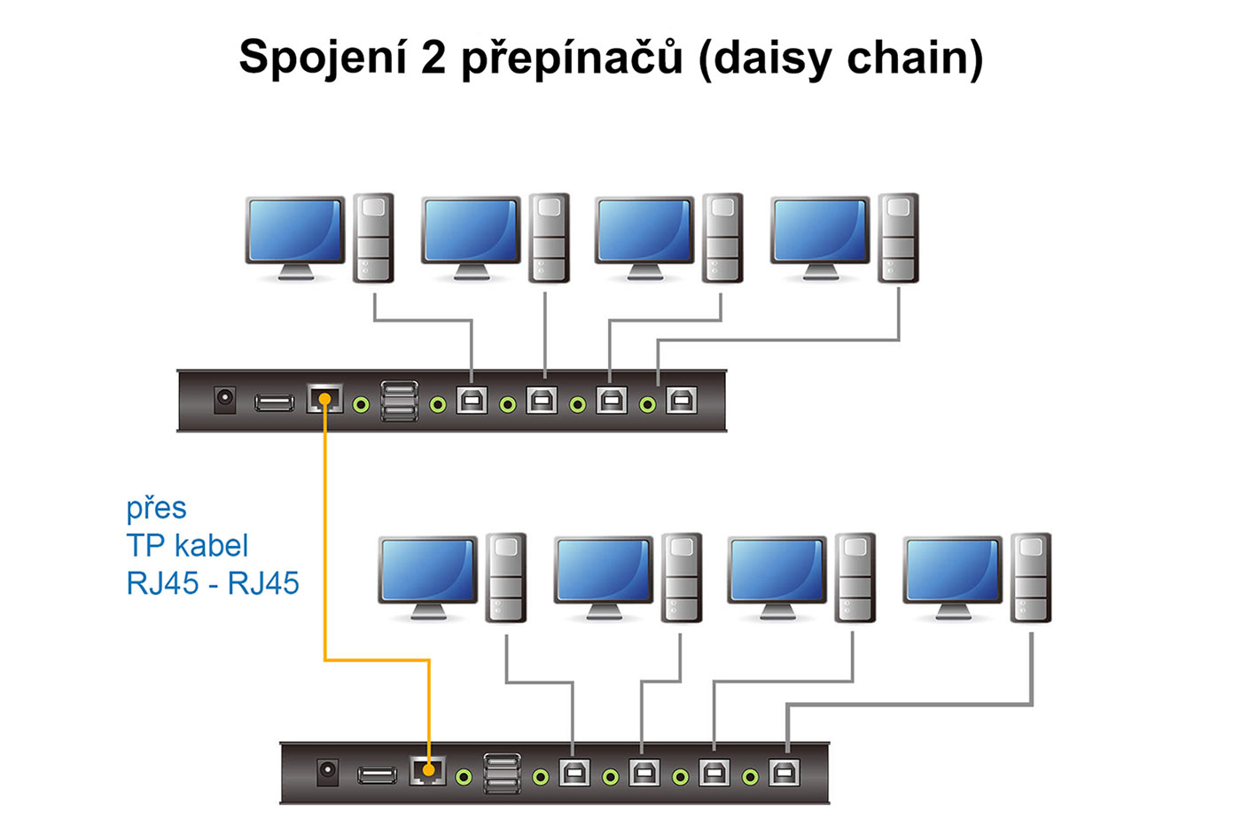 - Možnost spojení 2 přepínačů a ovládání až 8 počítačů