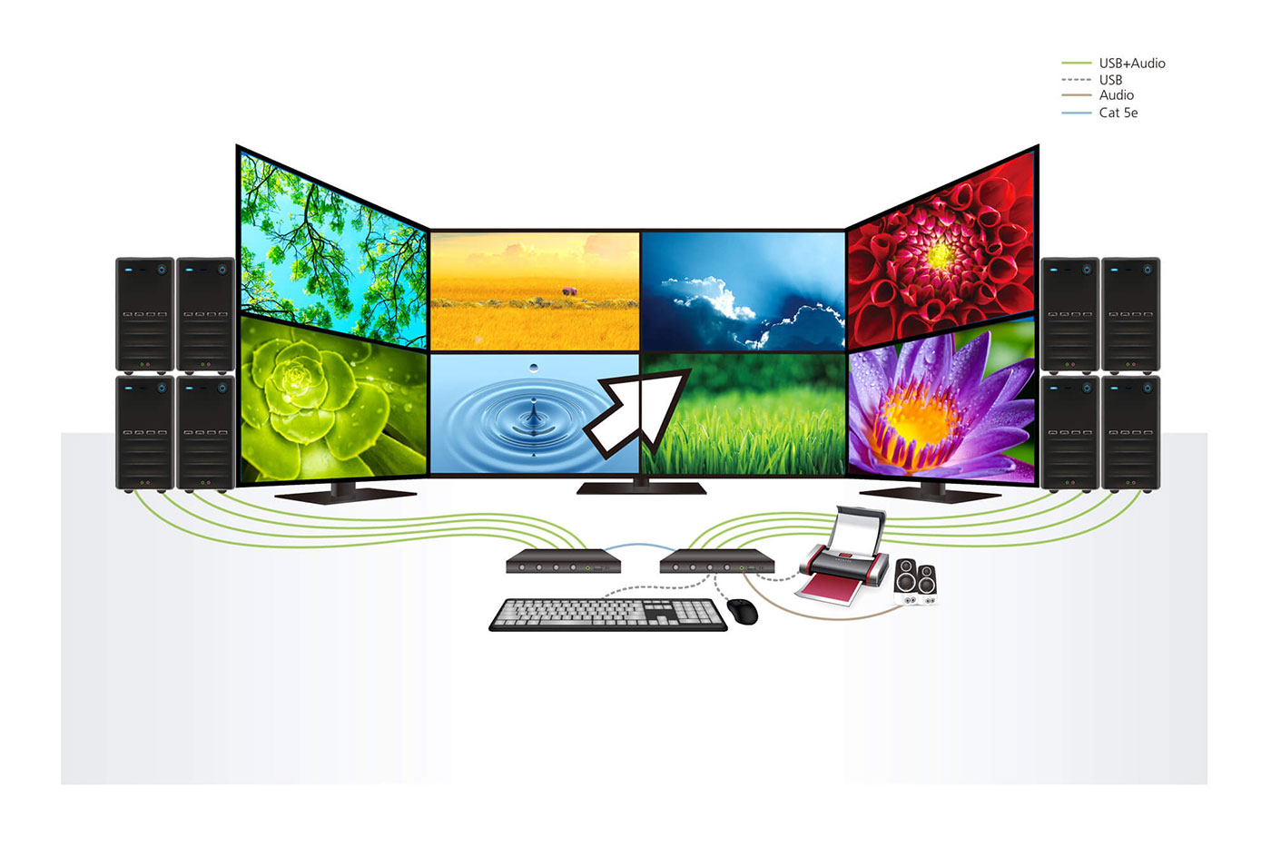 Ovládání až 4 počítačů s vlastními monitory (při použití 2 přepínačů až 8) z jednoho stanoviště. Umožňuje automatické přepínání mezi počítači při přechodu z jednoho monitoru na další.