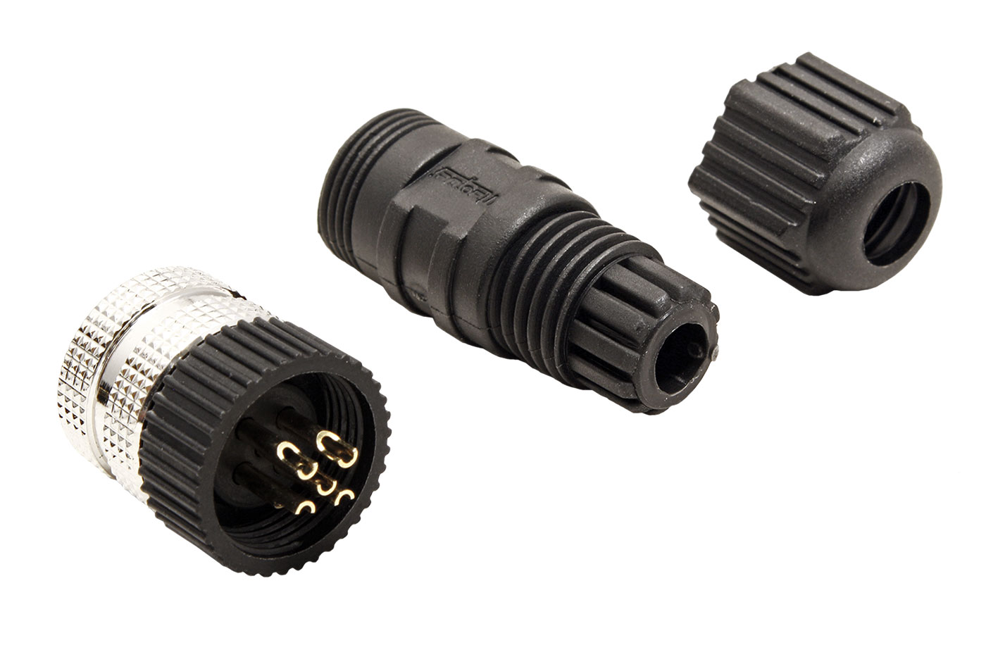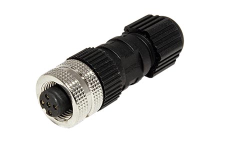 Kulatý 5 pinový konektor se šroubovým upevněním M12 a plastovým krytem. Samice s vnitřním závitem. Kód A.