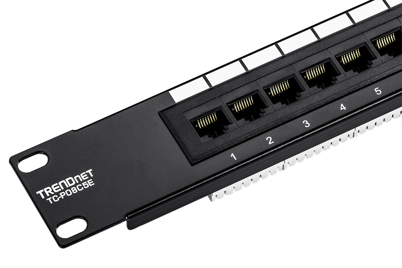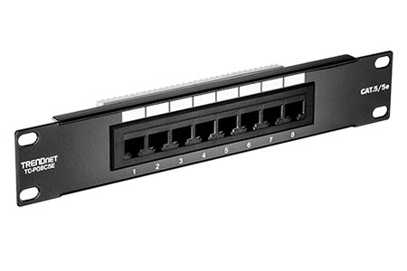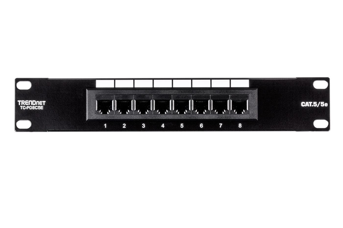 Nestíněný, 8 portový patchpanel kategorie 5e pro montáž do 10“ rozvaděče (výška 1U).