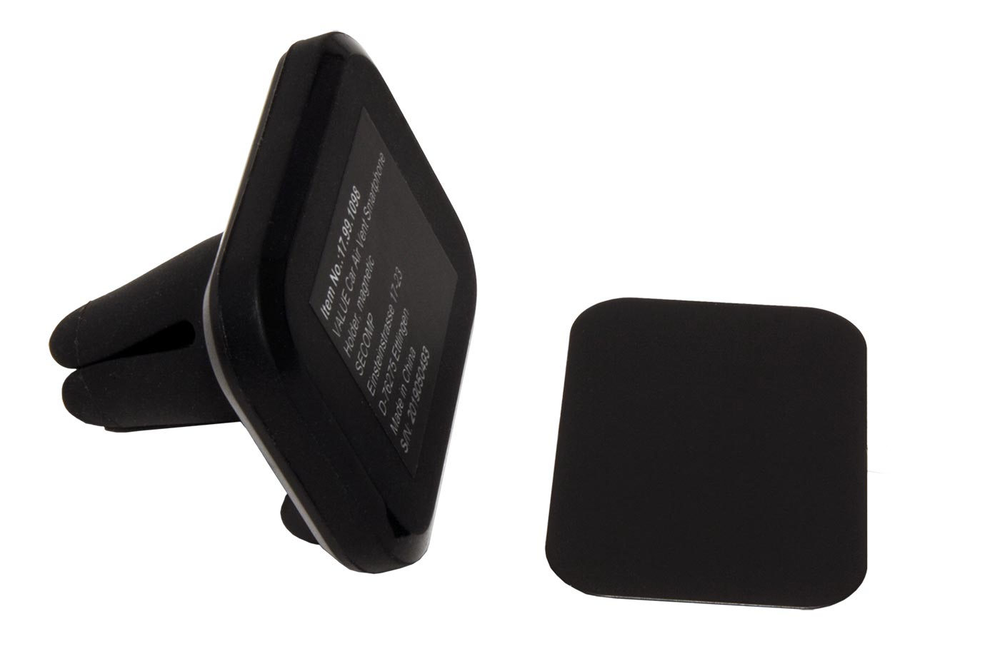 Pro jednoduché uchycení mobilního telefonu. Po nalepení kovové destičky na mobilní telefon je možno upevnit telefon na magnetickou základnu (zasouvá se do ventilační mřížky auta). Destičku je také možno bez lepení vložit mezi ochranné pouzdro telefonu a telefon.