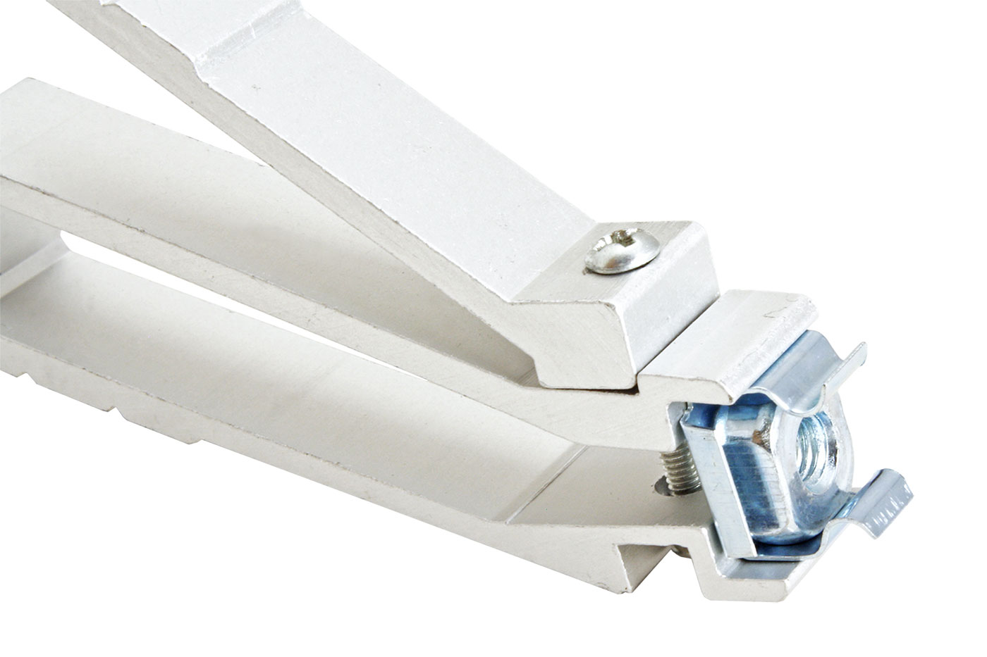 Jednoduchý nástroj pro snadné zmáčknutí přídržných pružin plovoucí matice při montáži do rozvaděče.