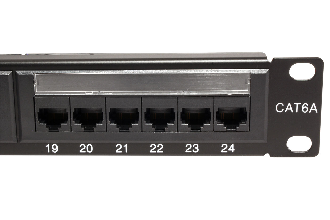 Nestíněný, 24-portový patchpanel kategorie 6a pro montáž na 19“ rozvaděč (výška 1U).