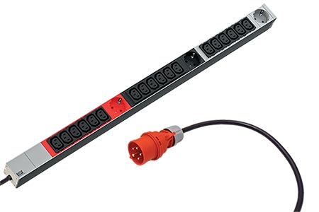 Vertikální napájecí panel vhodný pro montáž do velkých 19" rozvaděčů. S třífázovou vstupní vidlicí IEC60309 16A (červená). Zásuvky jsou rozděleny celkem do 3 segmentů (podle fází) po 6x IEC320/C13 + 1x CEE 7/3.