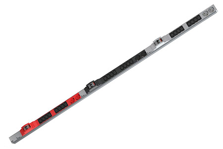 Vertikální napájecí panel vhodný pro montáž do velkých 19" rozvaděčů a pro napájení zařízení s odběrem až 16A s třífázovou vstupní vidlicí IEC60309 3x 32A (červená).