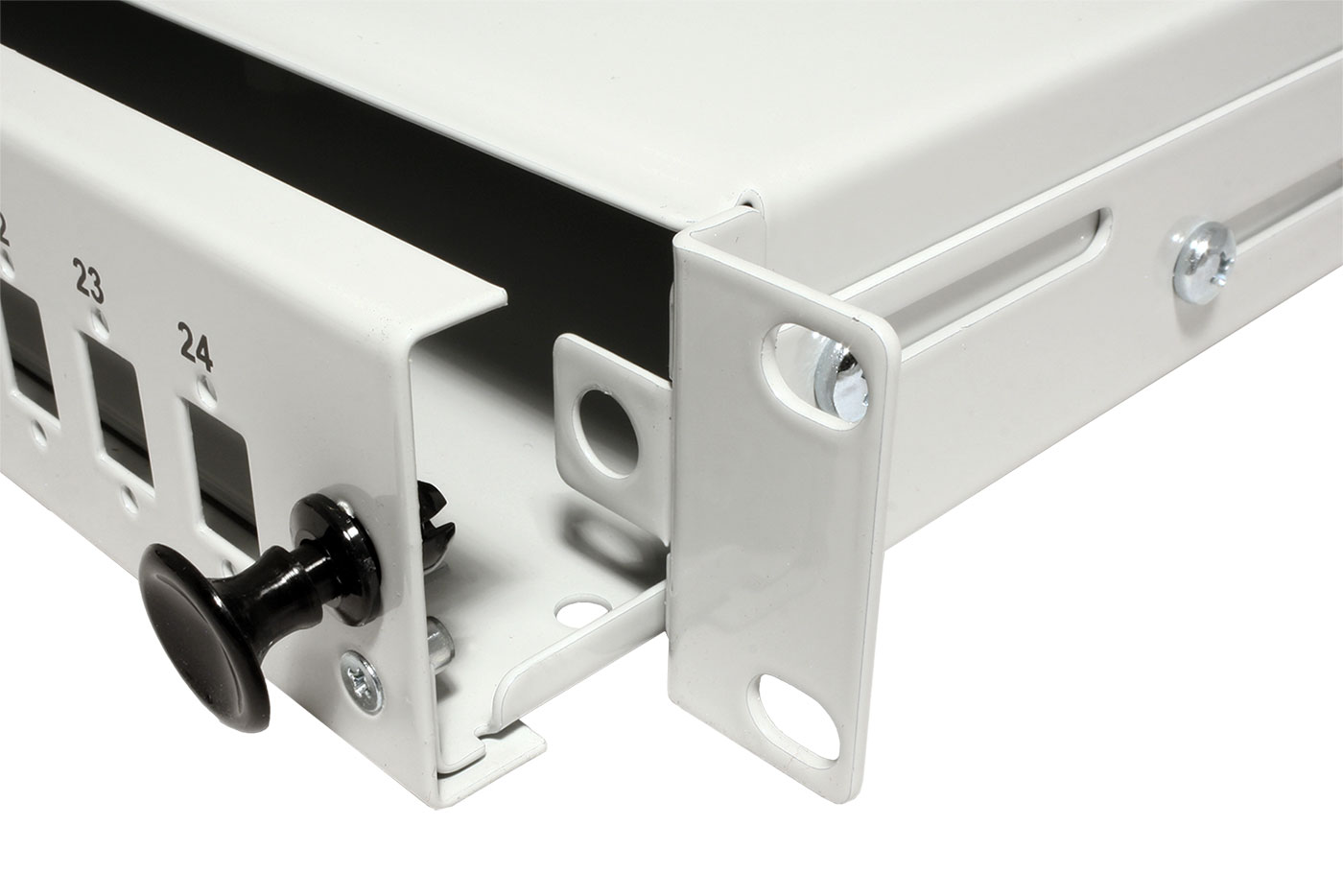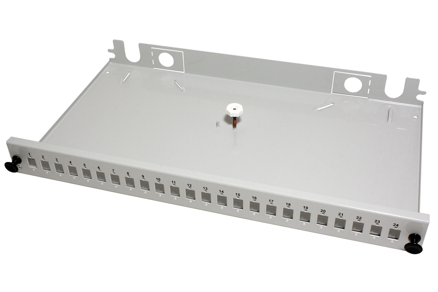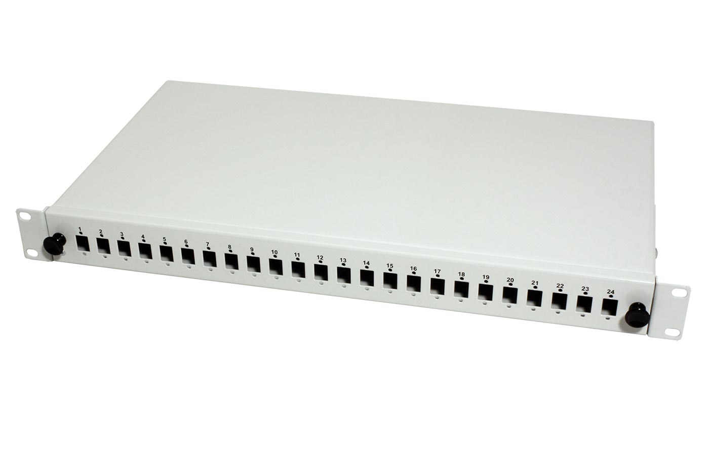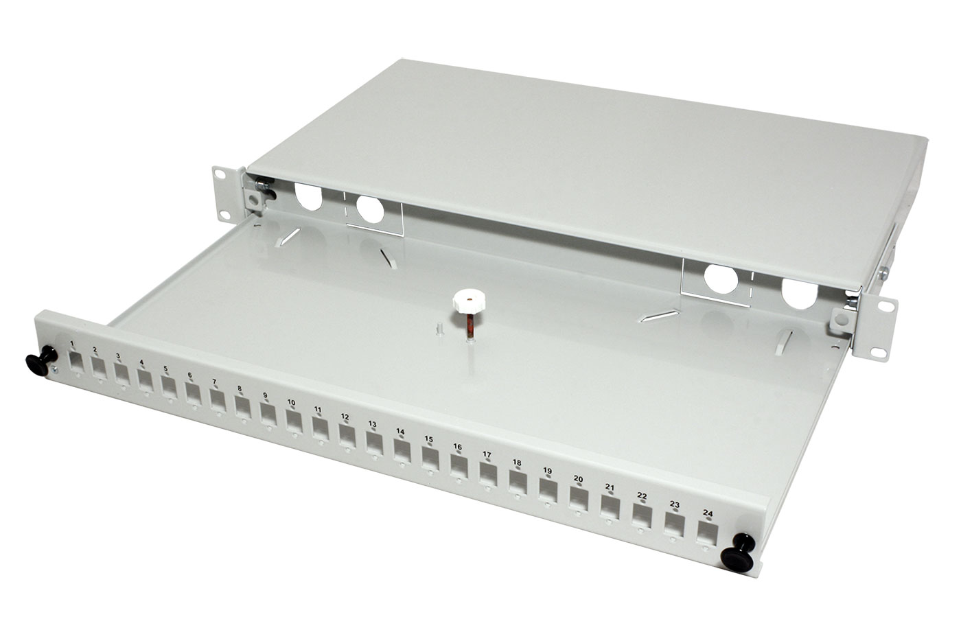19" optická vana pro zakončení optických kabelů. 24 pozic pro spojky SC simplex nebo LC duplex.