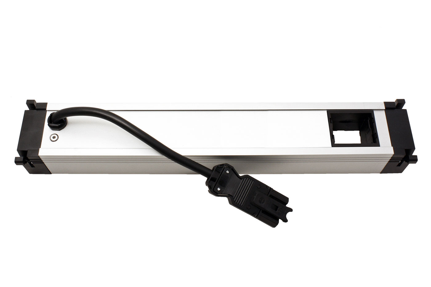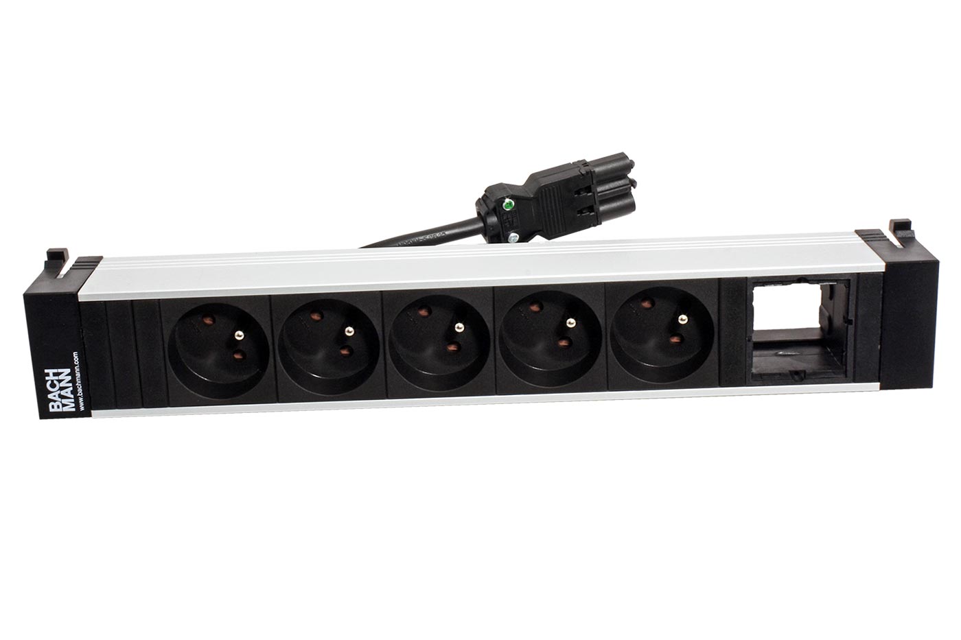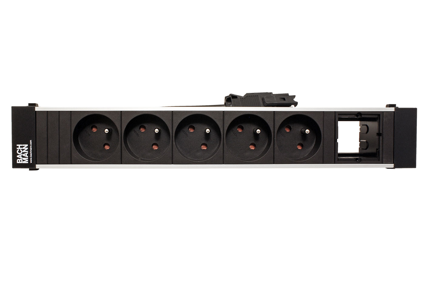 Box s 5 napájecími zásuvkami a 1 volnou pozicí, určený pro montáž do dlouhého rámu systému POWER FRAME.