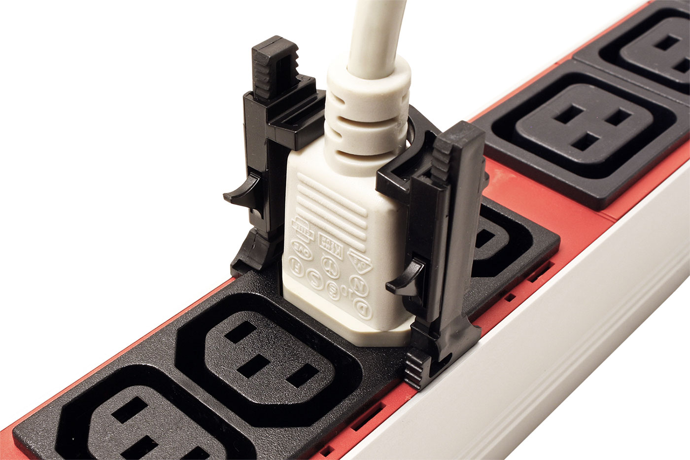 Plastová pojistka zamezující vytržení kabelu s konektorem C14 nebo C20 ze zásuvky.