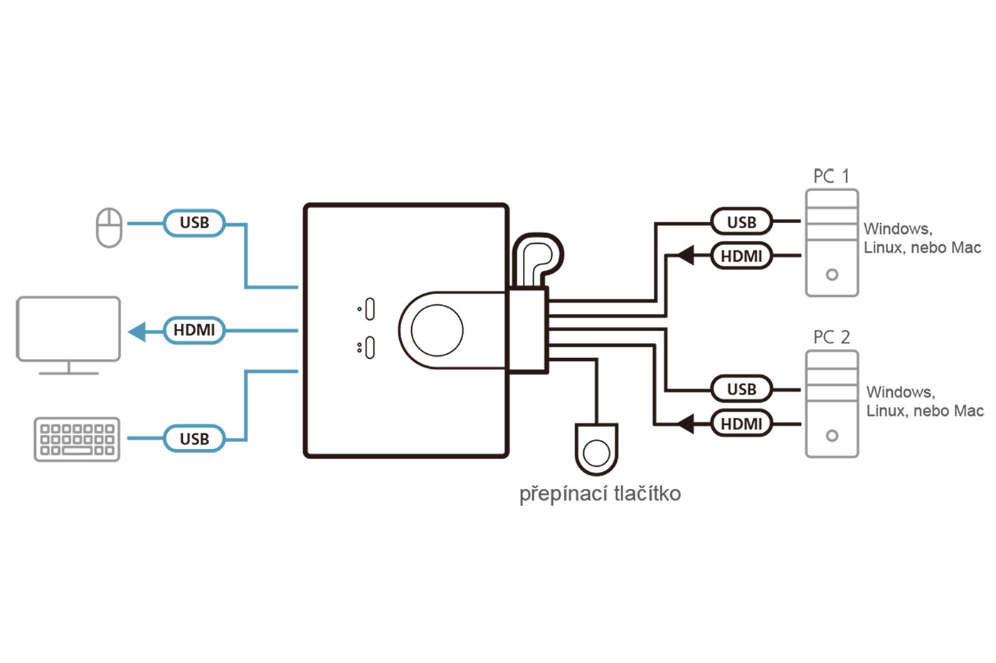 Přepínač pro ovládání 2 počítačů (USB klávesnice, HDMI video + audio, USB myš) z jednoho stanoviště. Počítače je možno startovat bez nutnosti přepnutí.