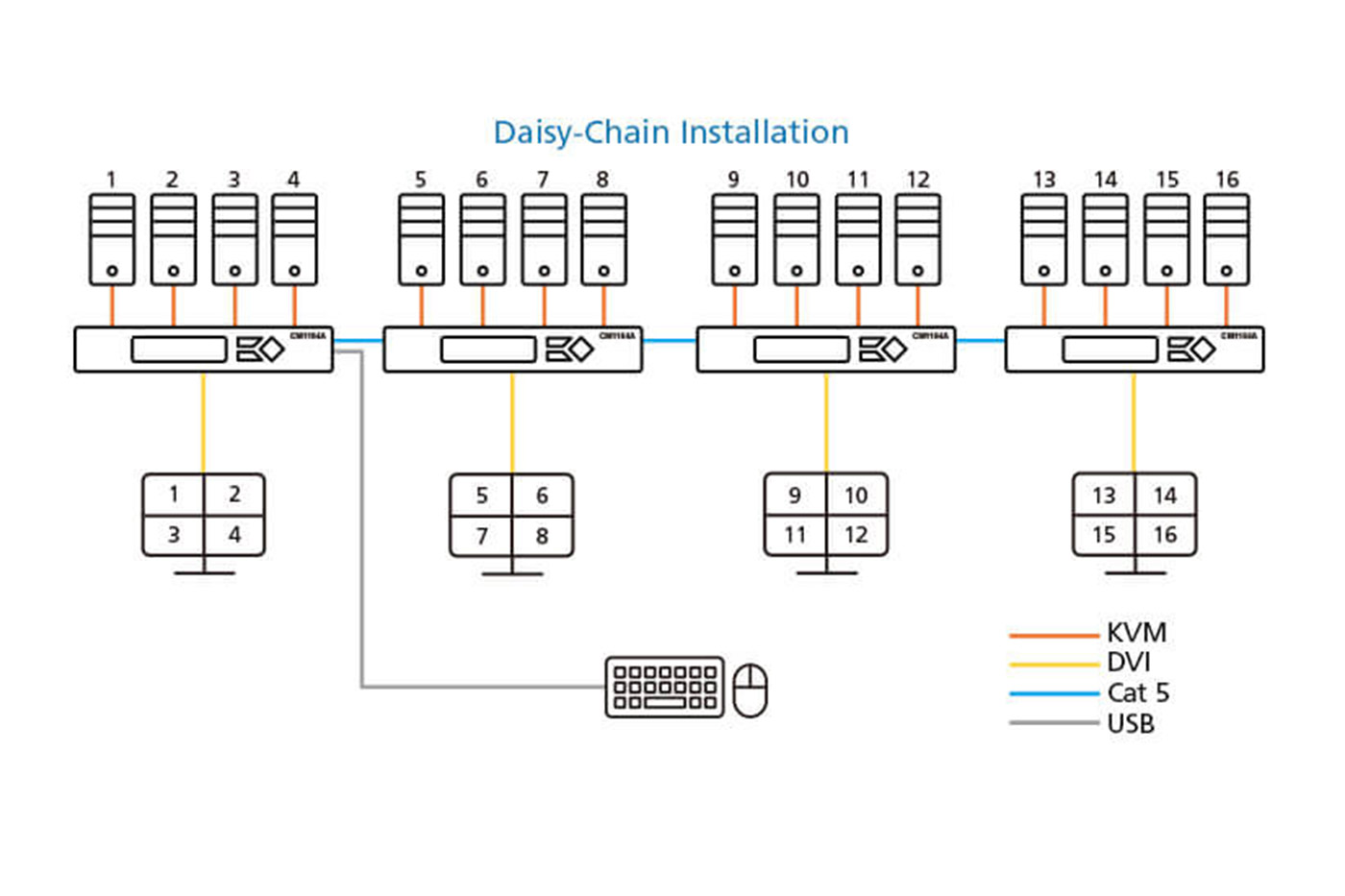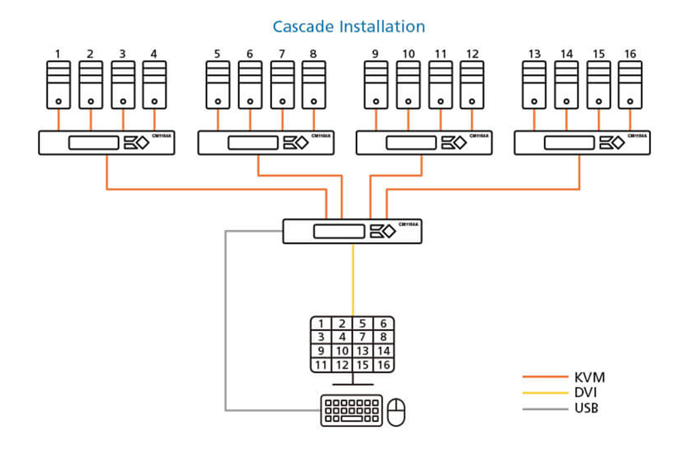 - Možnost kaskádovat až 2 úrovně — ovládání až 16 počítačů (s režimem až 4x4 Multi-view)