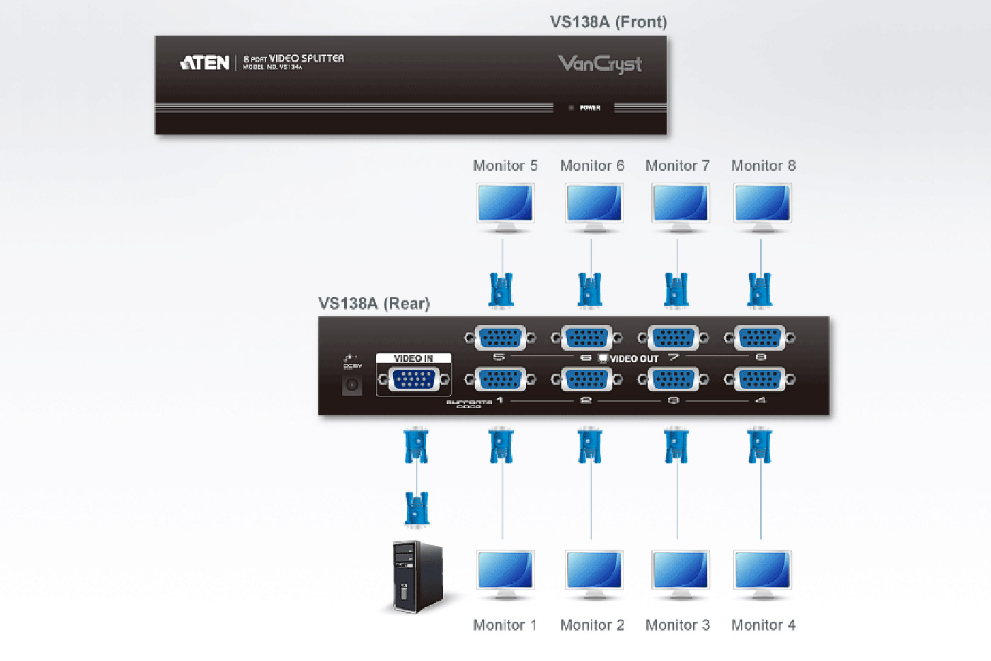 Pro připojení 8 zobrazovacích zařízení k 1 zdroji signálu VGA. Posílení VGA signálu.