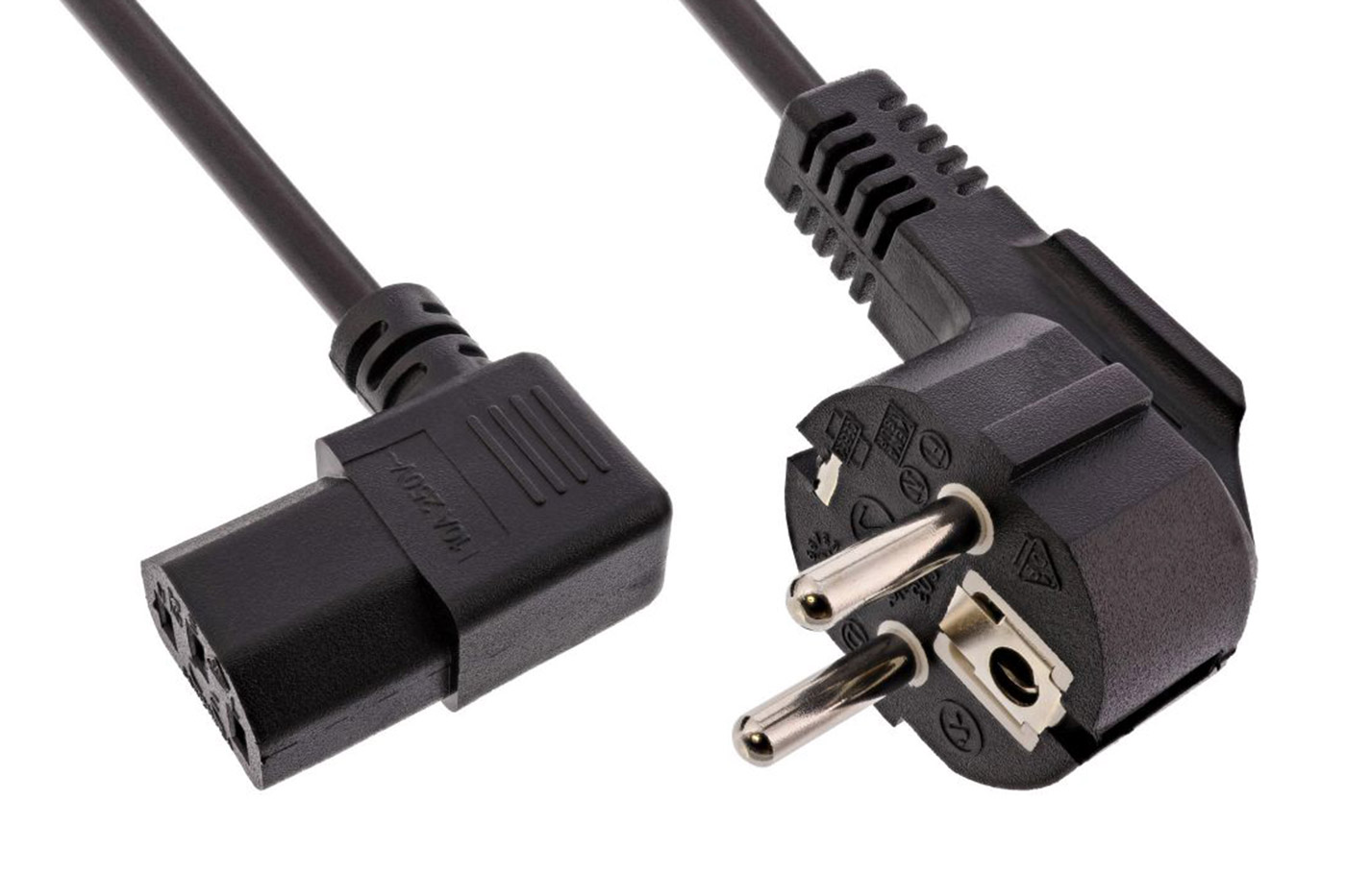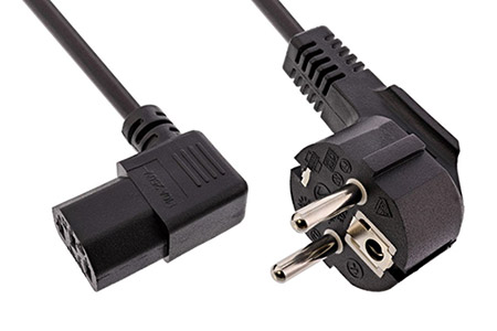 Pokud potřebujete zapojit zařízení k rozvodné síti se zásuvkou typu E nebo F (CZ, FR DE), použijte tento kabel. Na zařízení (standardní počítače, UPS…) musí být osazeny konektory IEC320 C14 (lichoběžník se svislými kontakty). Přístrojový konektor je lomený o 90° pro úsporu místa za připojeným zařízením.
