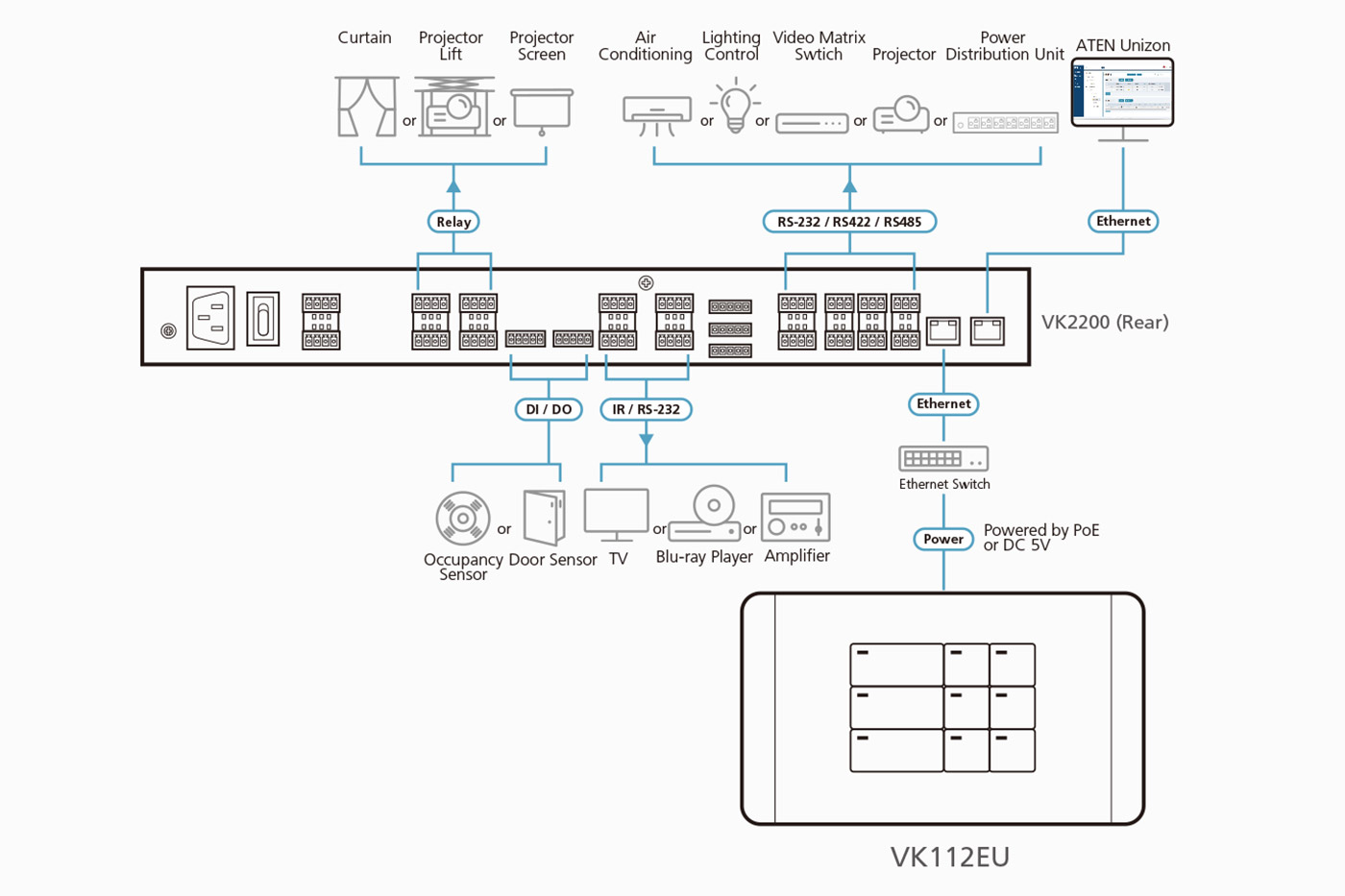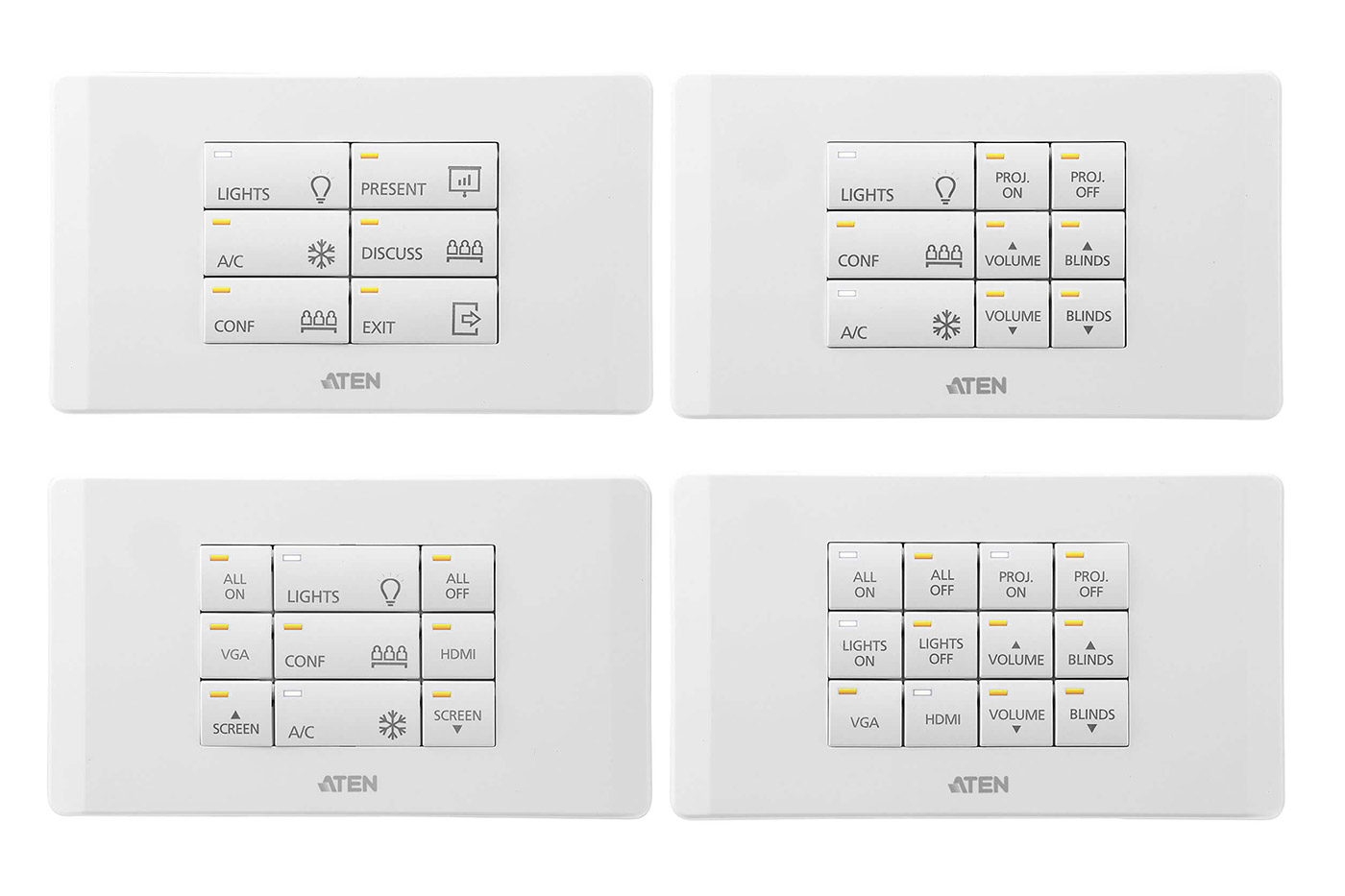 VK112EU je plně přizpůsobitelná klávesnice s 12 tlačítky navržená pro použití s ??řídicím systémem ATEN. Klávesnice poskytuje rozhraní pro ovládání zařízení v místnosti ze standardního nástěnného čelního panelu. Dvoudílná klávesnice byla vytvořena s ohledem na flexibilitu a lze ji rozložit do 125 různých kombinací 6 až 12 tlačítek.