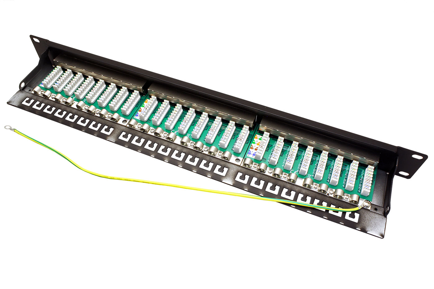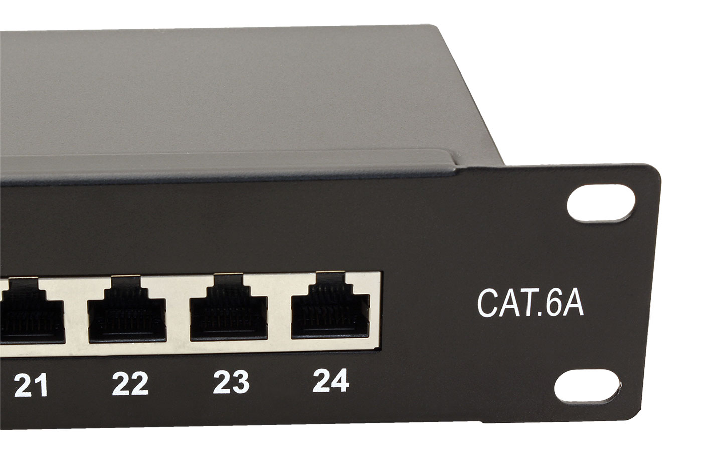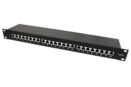 Stíněný, 24-portový patchpanel kategorie 6a pro montáž do 19“ rozvaděče (výška 1U).