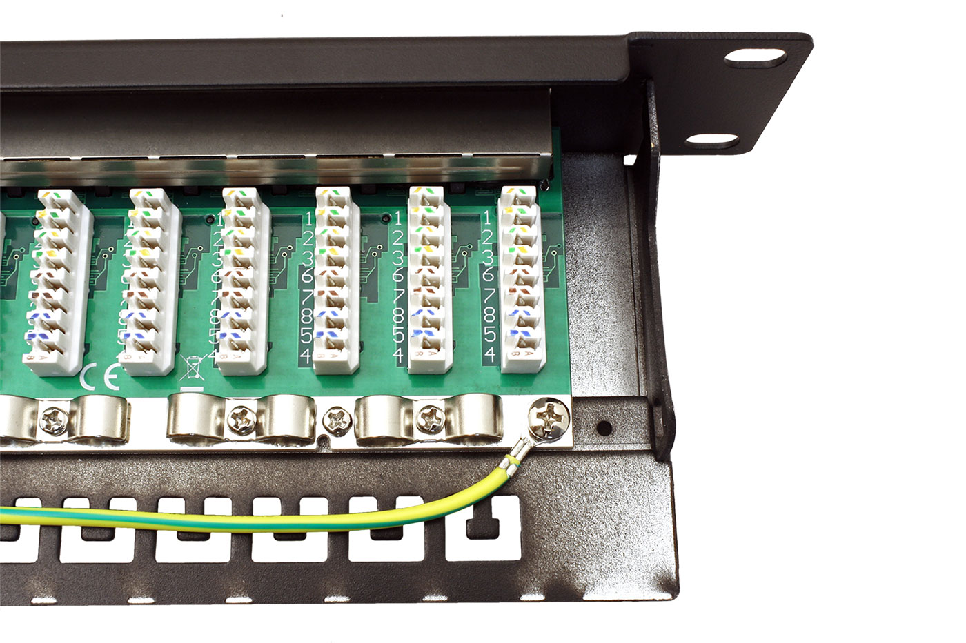 Patchpanel pro strukturovanou kabeláž kat. 6a s nařezávacími konektory LSA+ pro zakončení kabelů pevné instalace.