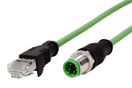 Průmyslový kabel s konektory M12D/4M a konektorem RJ45.