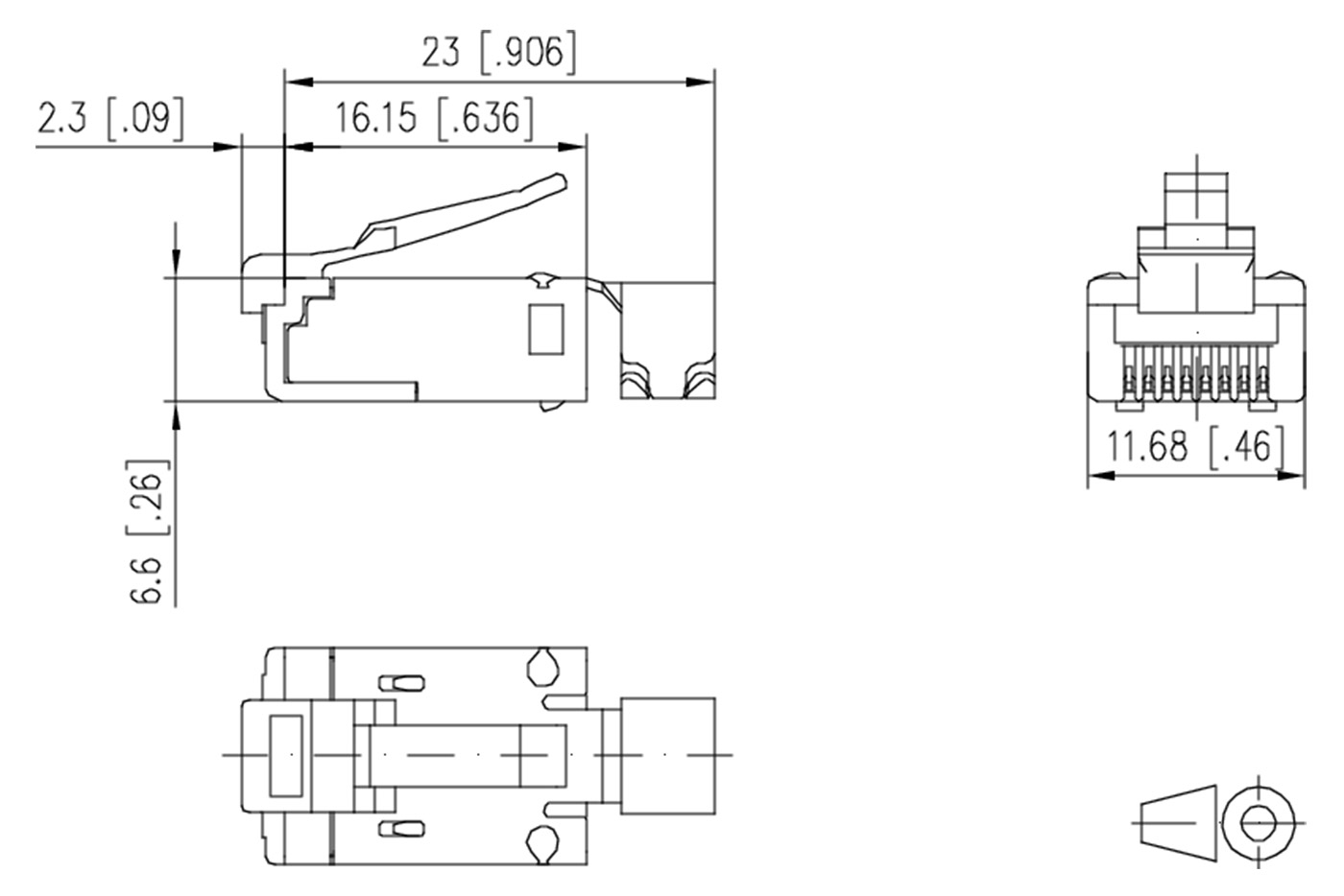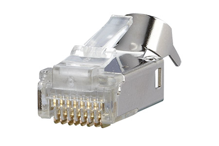 Stíněný konektor RJ45 kat. 6 určený k nalisování (krimpování) na kulatý kabel AWG 24 - 27. 8 pozic 8 kontaktů(8P8C), na drát i lanko.