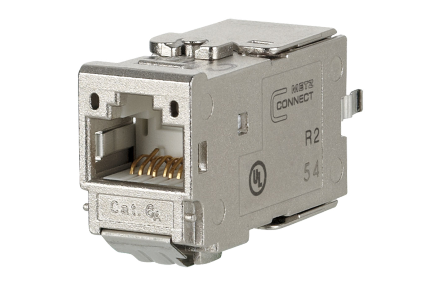 Konektor RJ45 kategorie 6a v provedení pro osazení do panelu (MC) s nařezávacími kontakty a vývodem kabelu v pozici 180° proti konektoru.