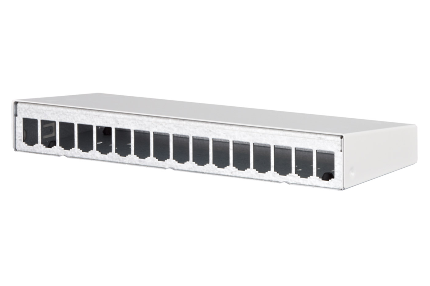 Stíněný, 16-portový patchpanel určený pro montáž na stěnu.