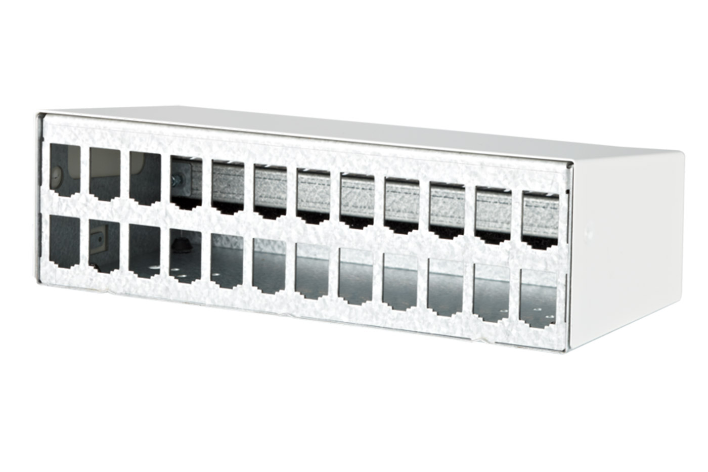 Stíněný, 24-portový patchpanel určený pro montáž na stěnu.