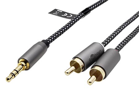 Kvalitní audio kabel s konektory jack 3,5mm a cinch (RCA).
