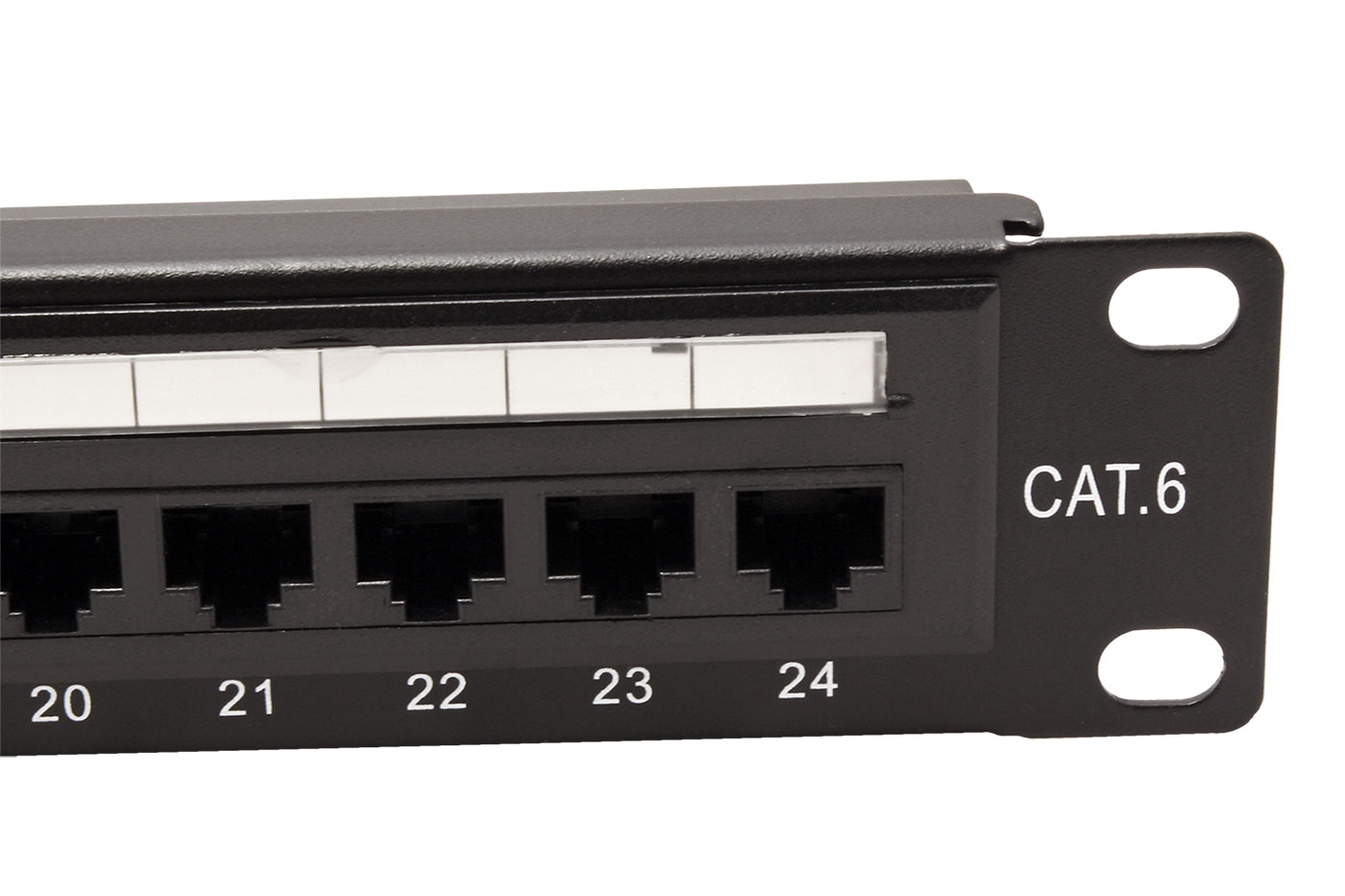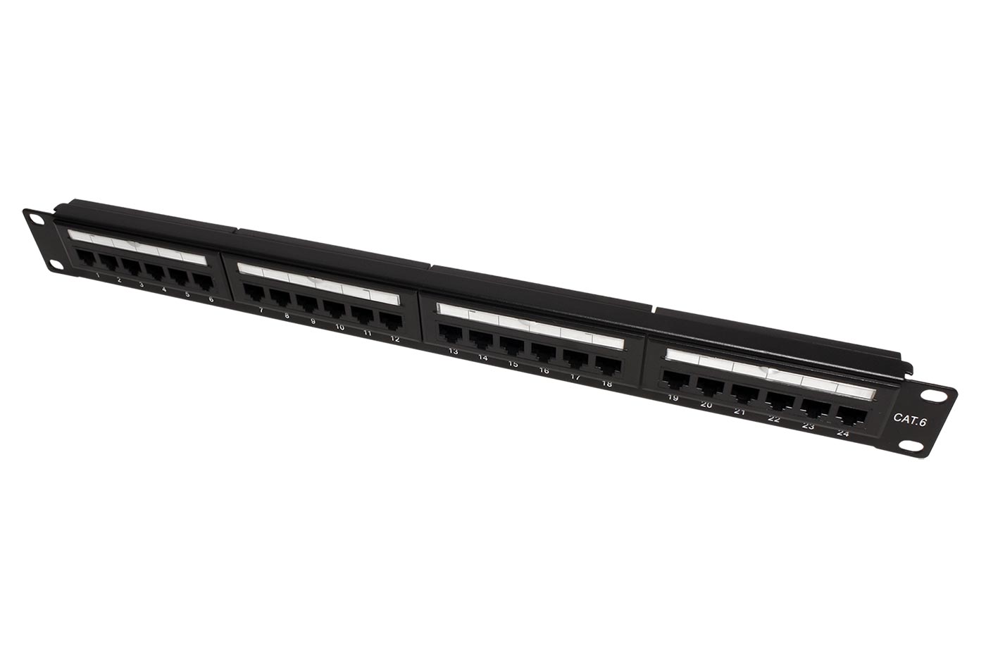 Nestíněný, 24-portový patchpanel kategorie 6 pro montáž do 19“ rozvaděče (výška 1U).