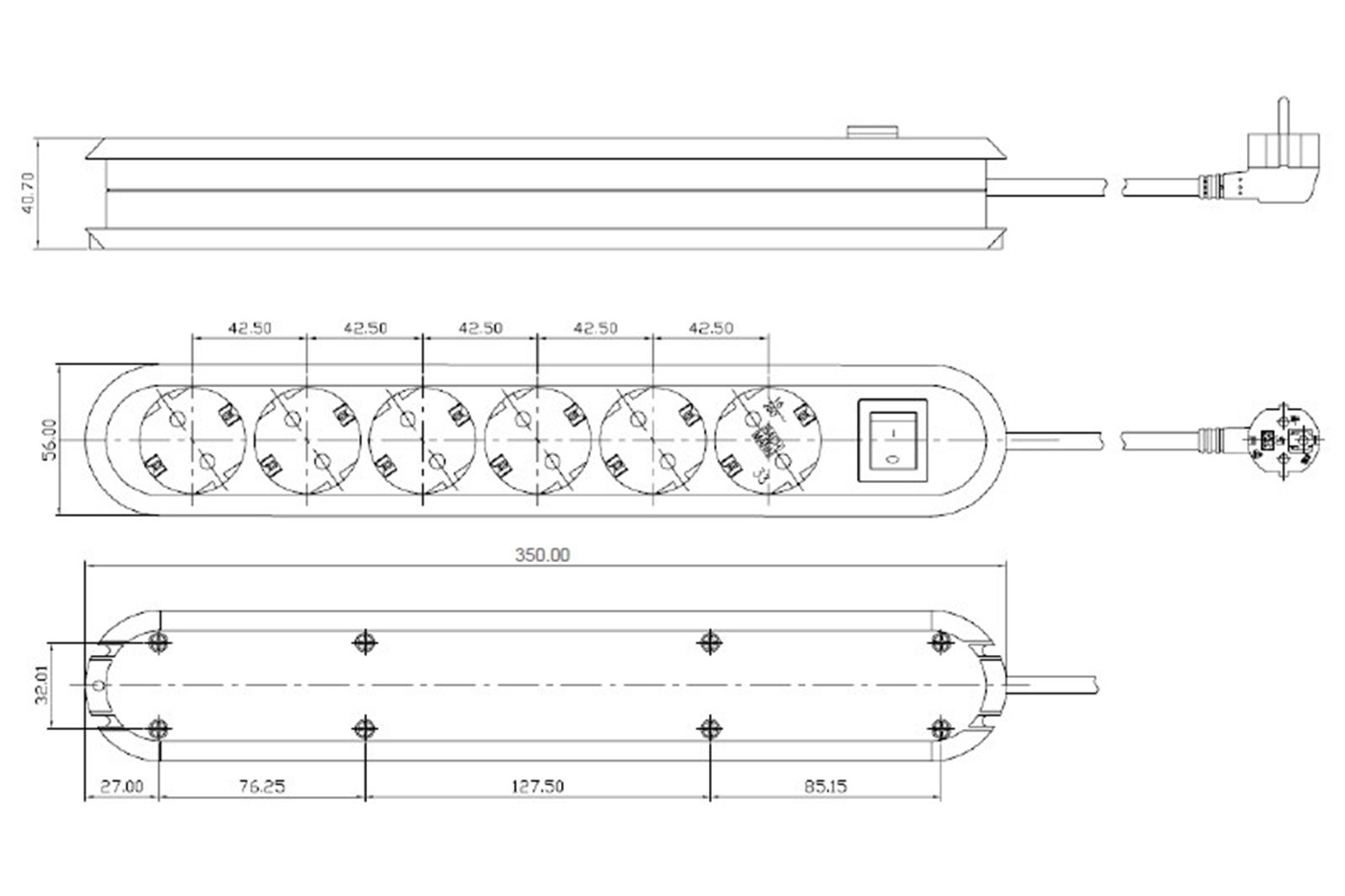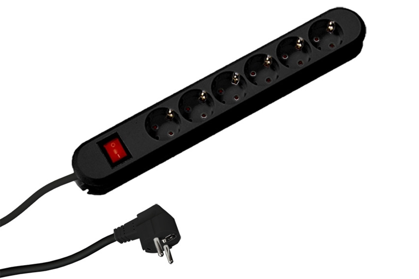 Šestinásobná zásuvka s vypínačem a prodlužovacím kabelem. Zásuvky typ F (německé), vidlice typ E/F (univerzální pro zásuvky s ochranným kolíkem nebo bočními kontakty).
