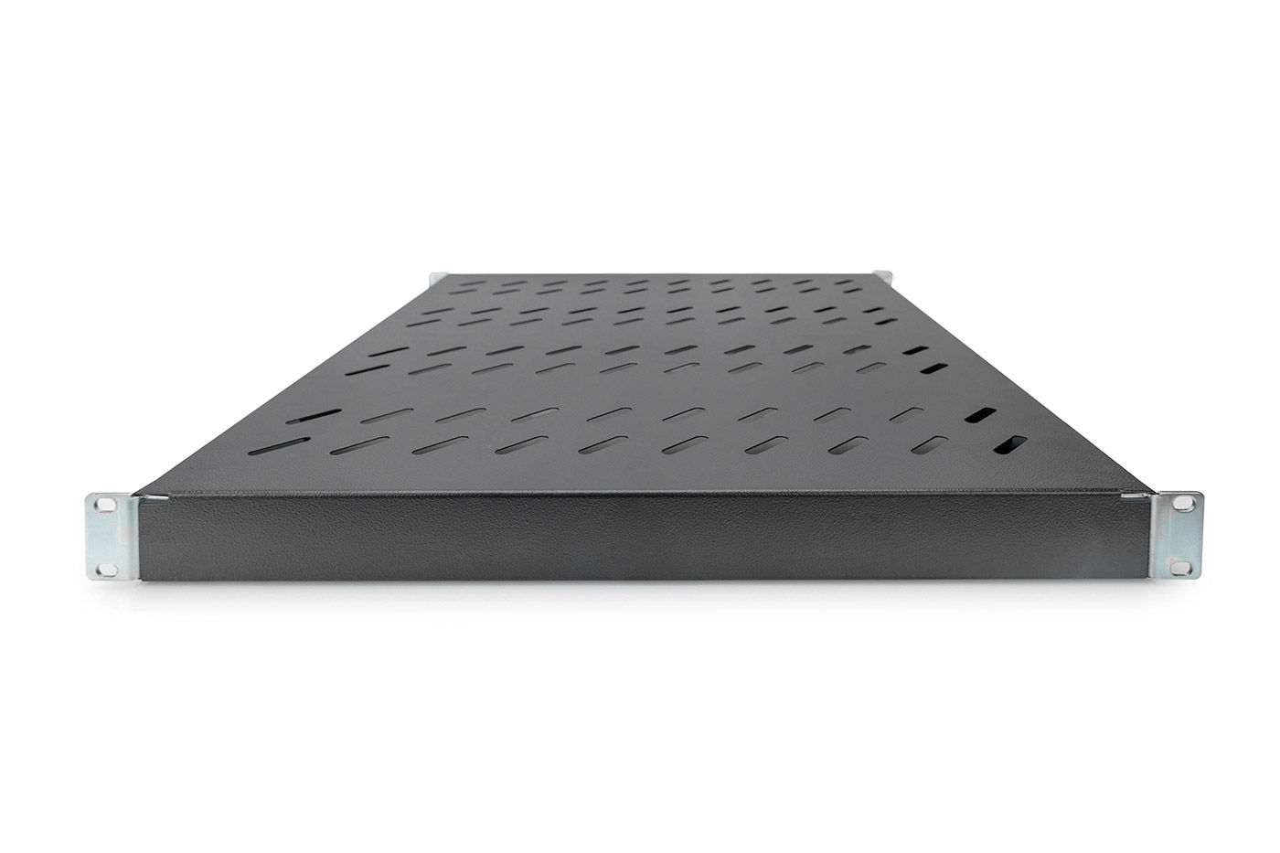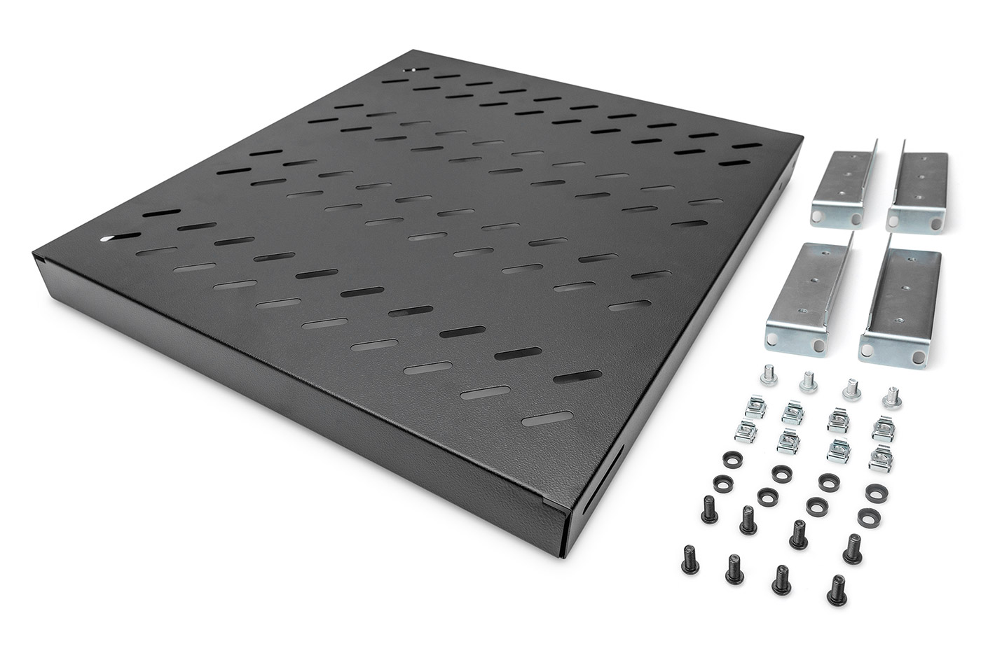 19" 1U pevná police hluboká 500mm s uchycením vpředu a vzadu.