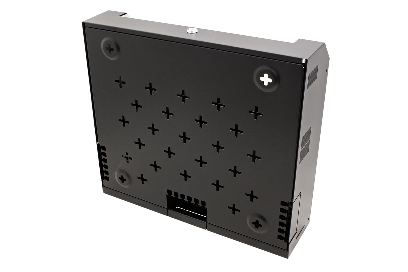 Kompaktní rozvaděč pro instalaci aktivních i pasivních komponent počítačových a telekomunikačních sítí. Závěsné provedení vhodné pro omezené prostory v domácnosti i kanceláři. Konfigurovatelný na 5 horizontálních pozic (hloubka 9cm), nebo 2horizontální + 3 vertikální (hloubka 26cm)